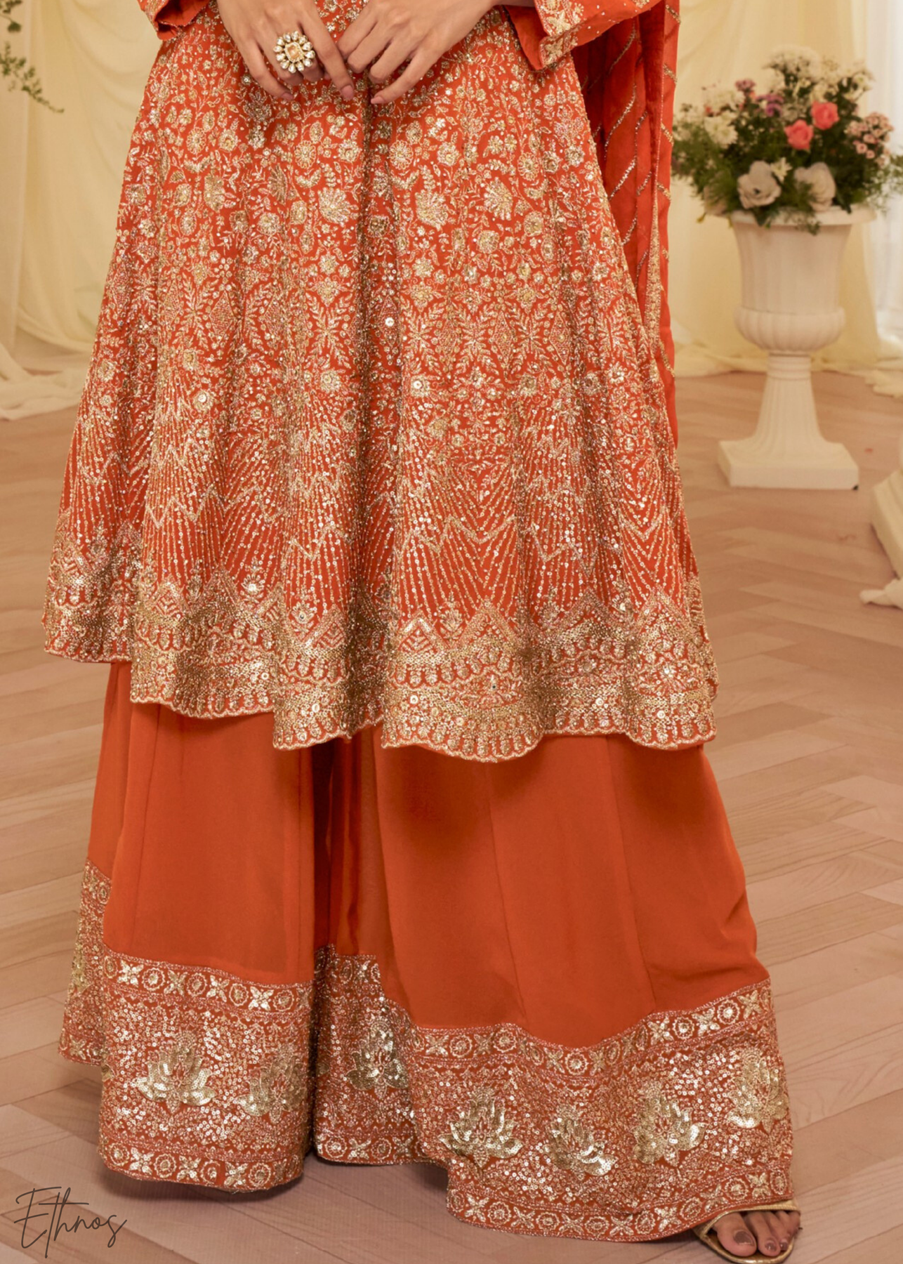 Radiate elegance in this vibrant orange georgette anarkali palazzo suit, a perfect ensemble for festive gatherings and weddings. Crafted from lightweight and flowy georgette, the set features a gracefully flared silhouette that ensures effortless movement and all-day comfort. Intricate embroidery and sequin detailing add a sophisticated touch of sparkle, while the matching palazzos offer a modern, breezy fit.