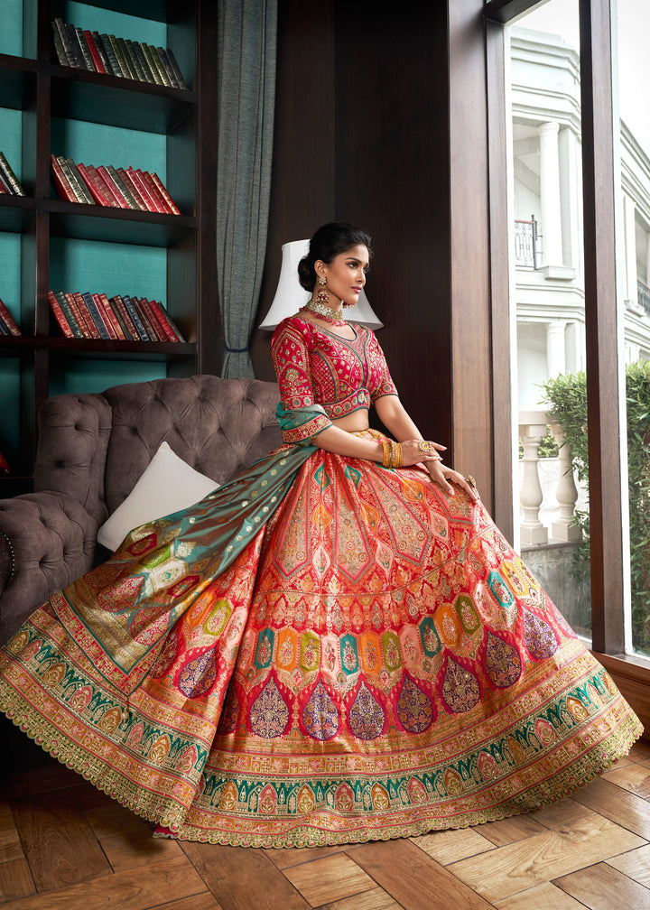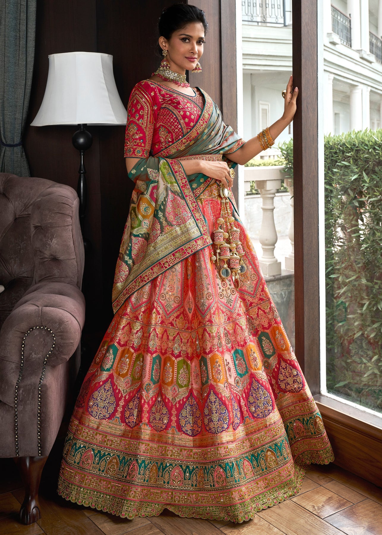 Jade Green & Pink Banarasi Silk Lehenga with Zarkan Codding work