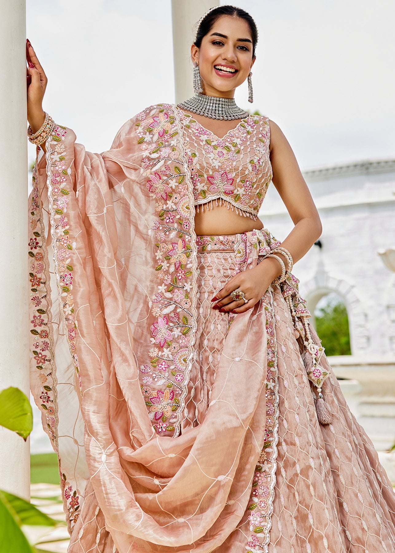 Nude Satin Silk Lehenga Choli with Sequinned Embroidered