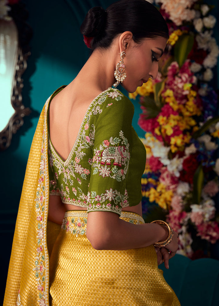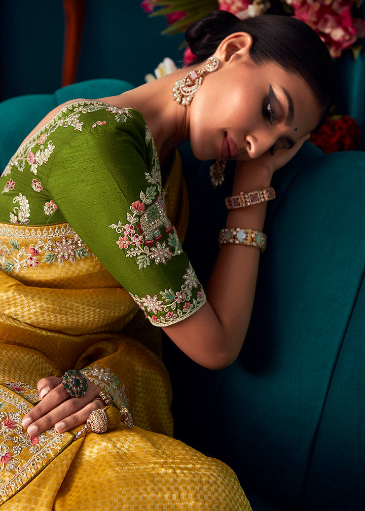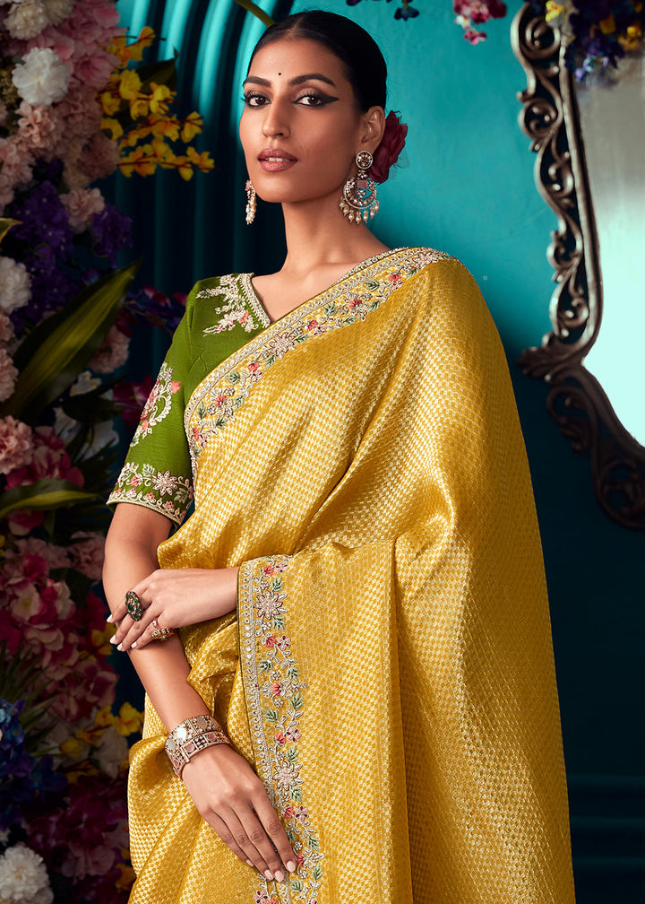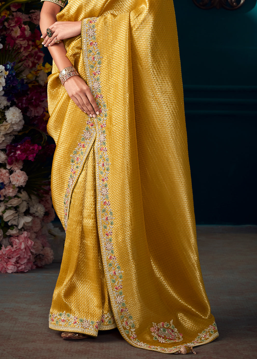 Golden Yellow Woven Kanjivaram Silk Saree with Sequin,Stone,Khatli & Pearl work