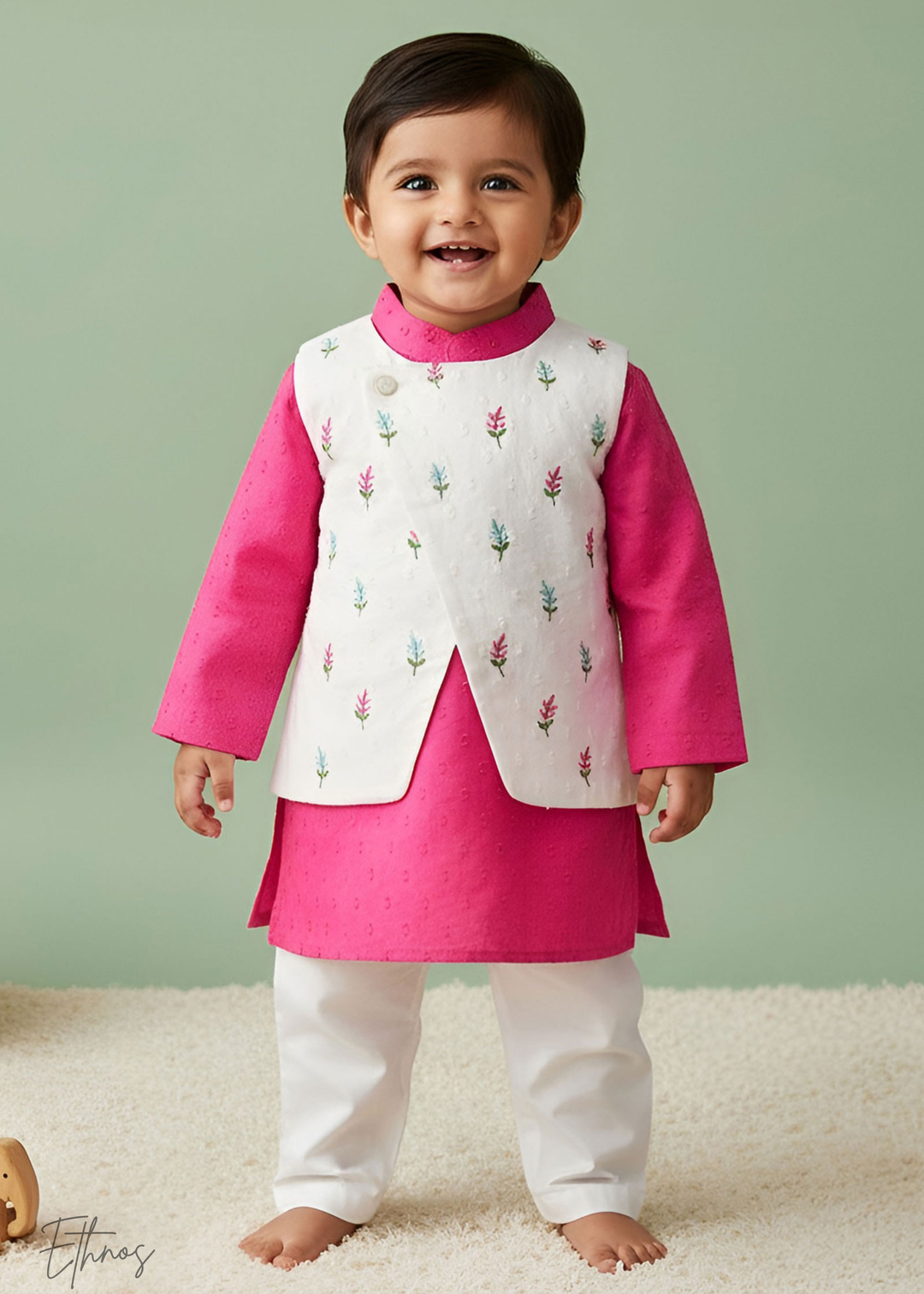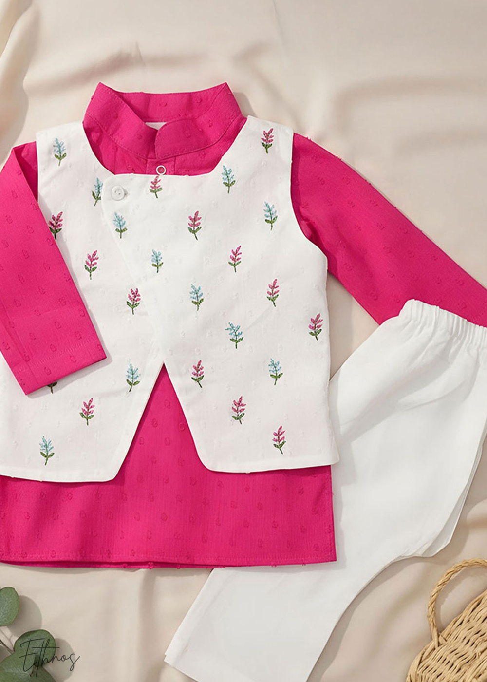 Organic Cotton Pink & White kurta Set with Jacket - Floral