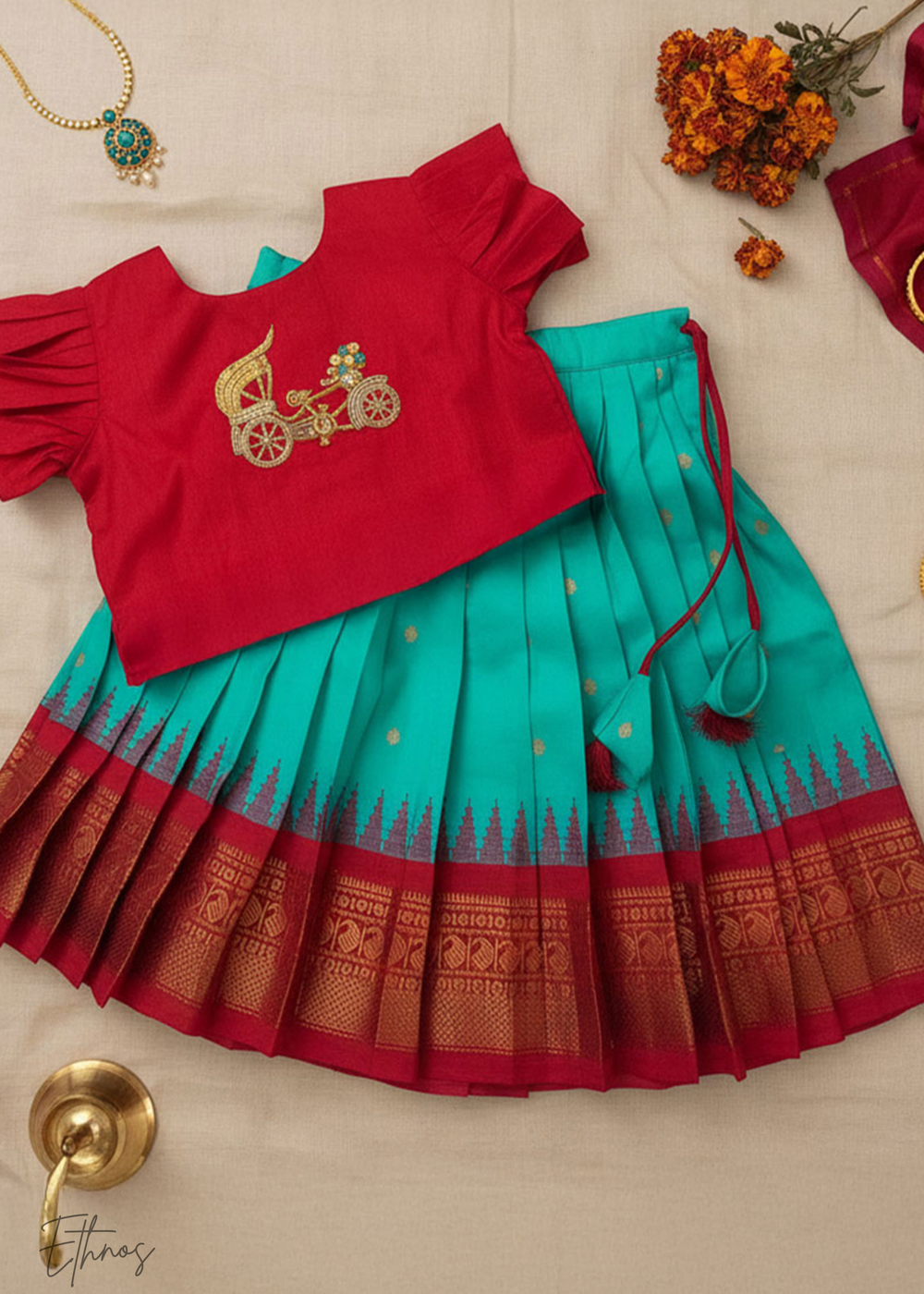 Raw Silk Red and Green Lehenga - Carriage