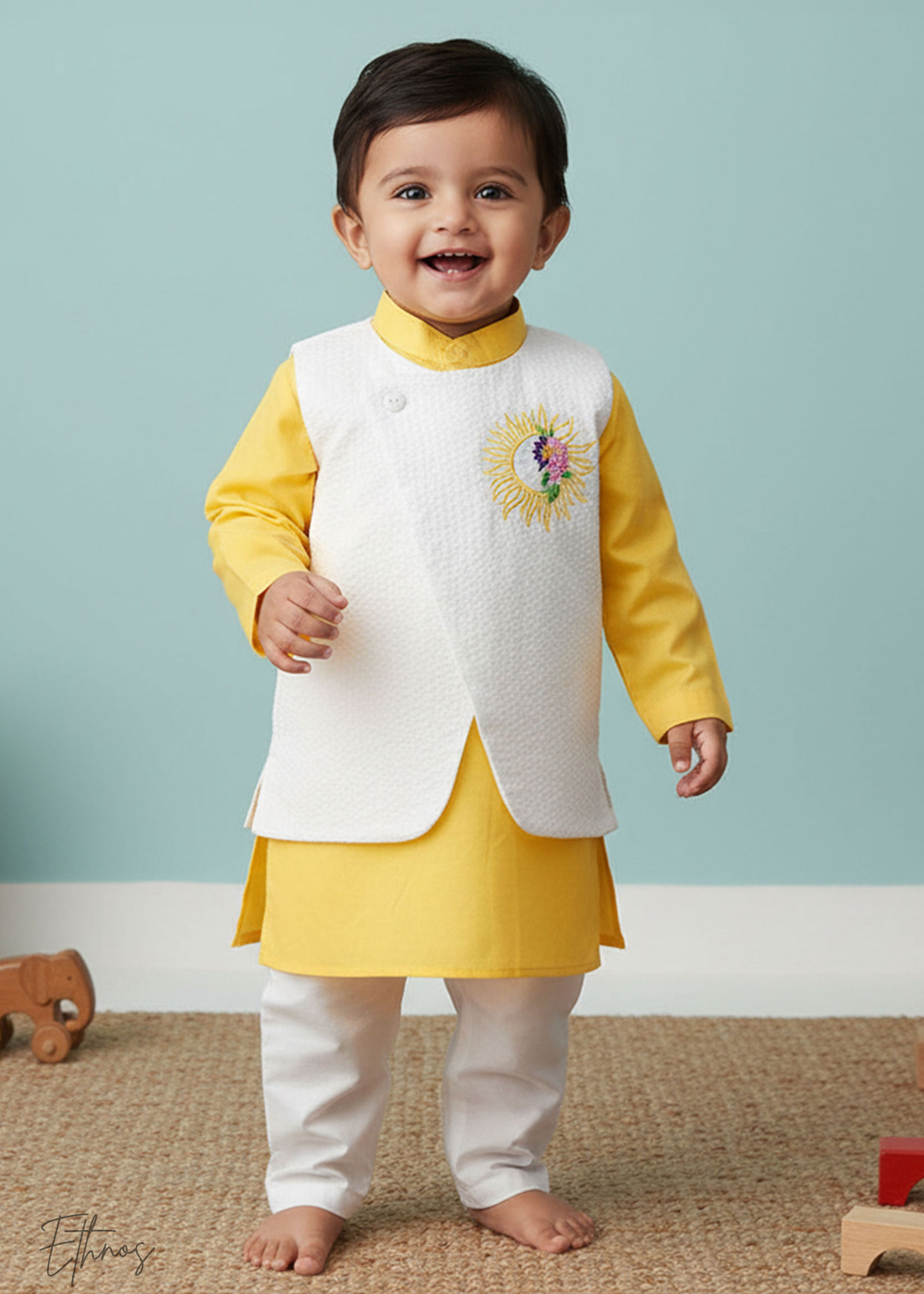 Organic Cotton Embroidered Yellow Kurta paired with Pajama Pants - Little Prince
