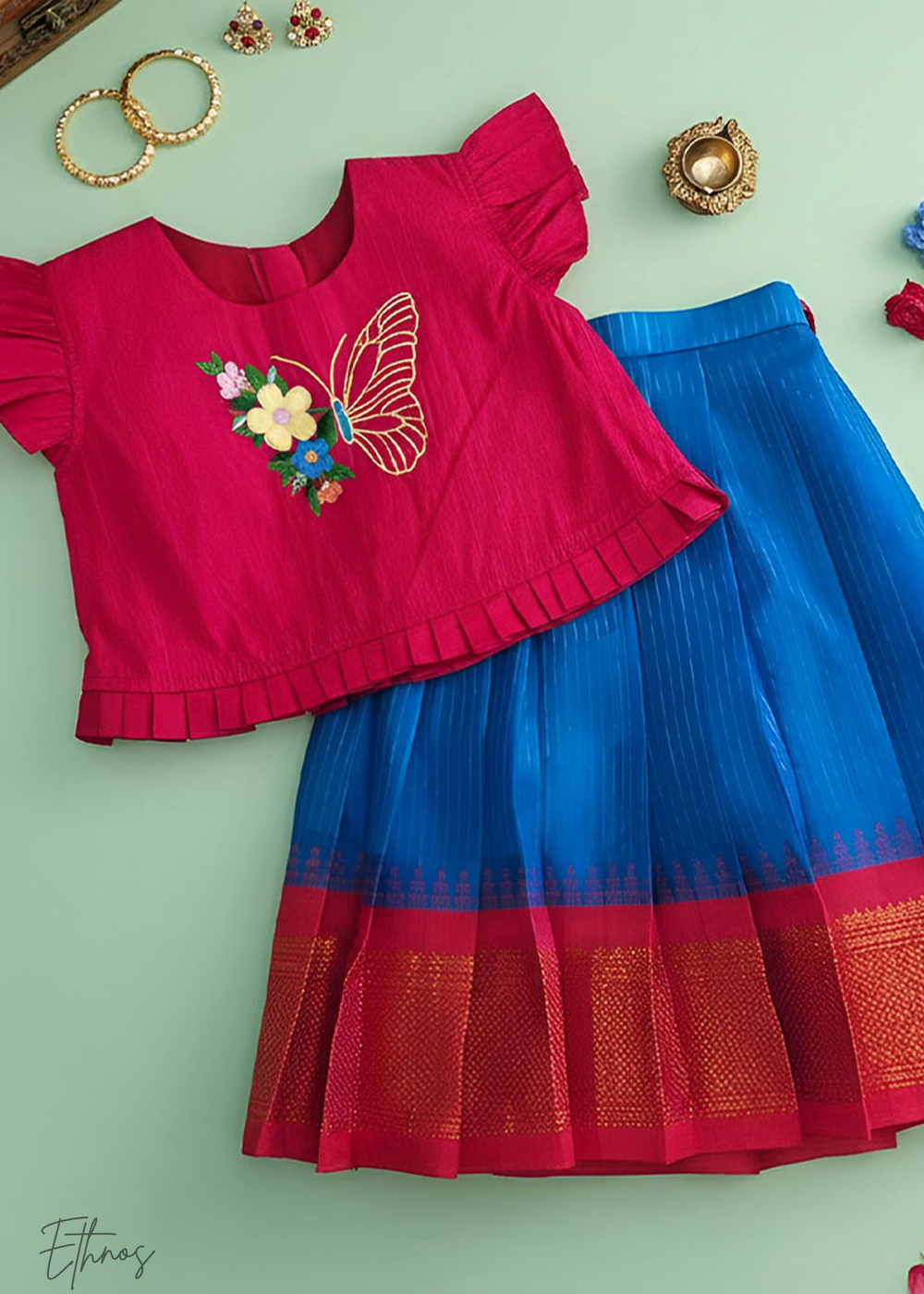 Raw Silk Pink and Blue Lehenga - Butterfly