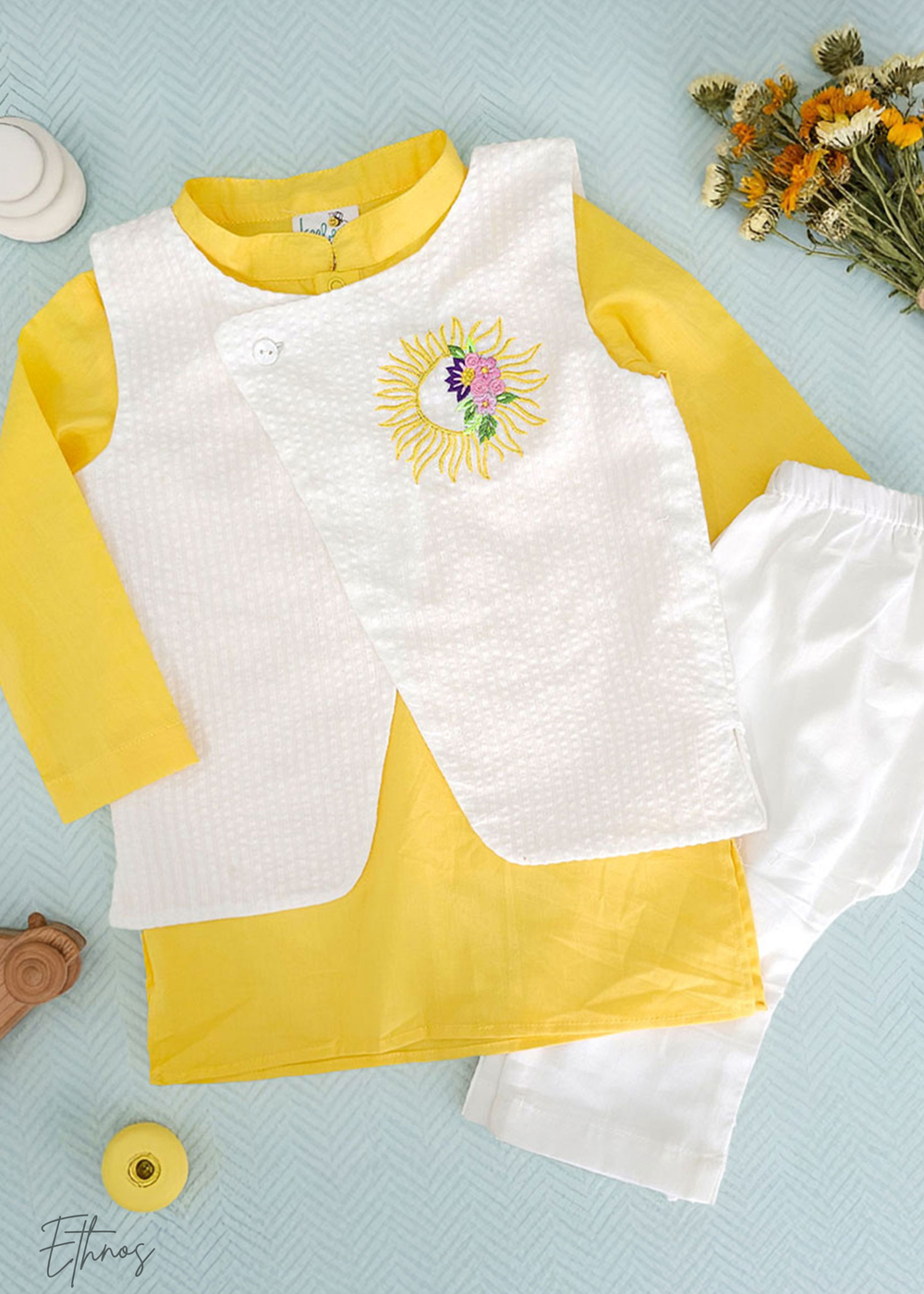 Organic Cotton Yellow & White kurta Set with Jacket - Floral