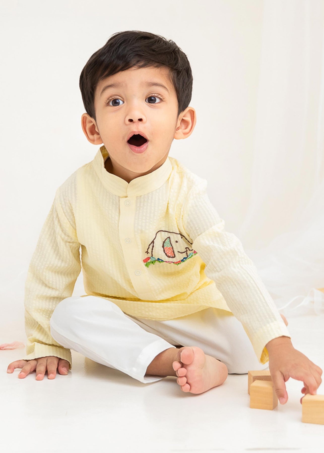Let your little one march in style with our Happy Elephant Kurta Set. This charming light yellow-colored kurta is crafted from soft organic cotton and features an adorable hand-embroidered elephant surrounded by colorful floral detailing. Paired with comfortable white cotton pants, this set offers a playful yet elegant look for festive occasions, family gatherings, or casual outings.