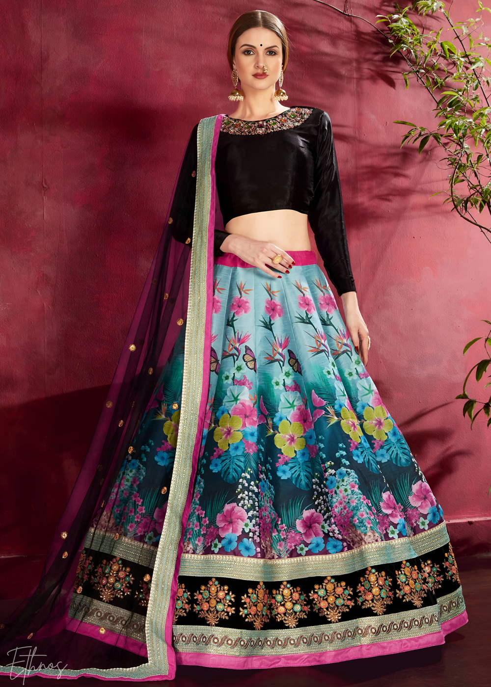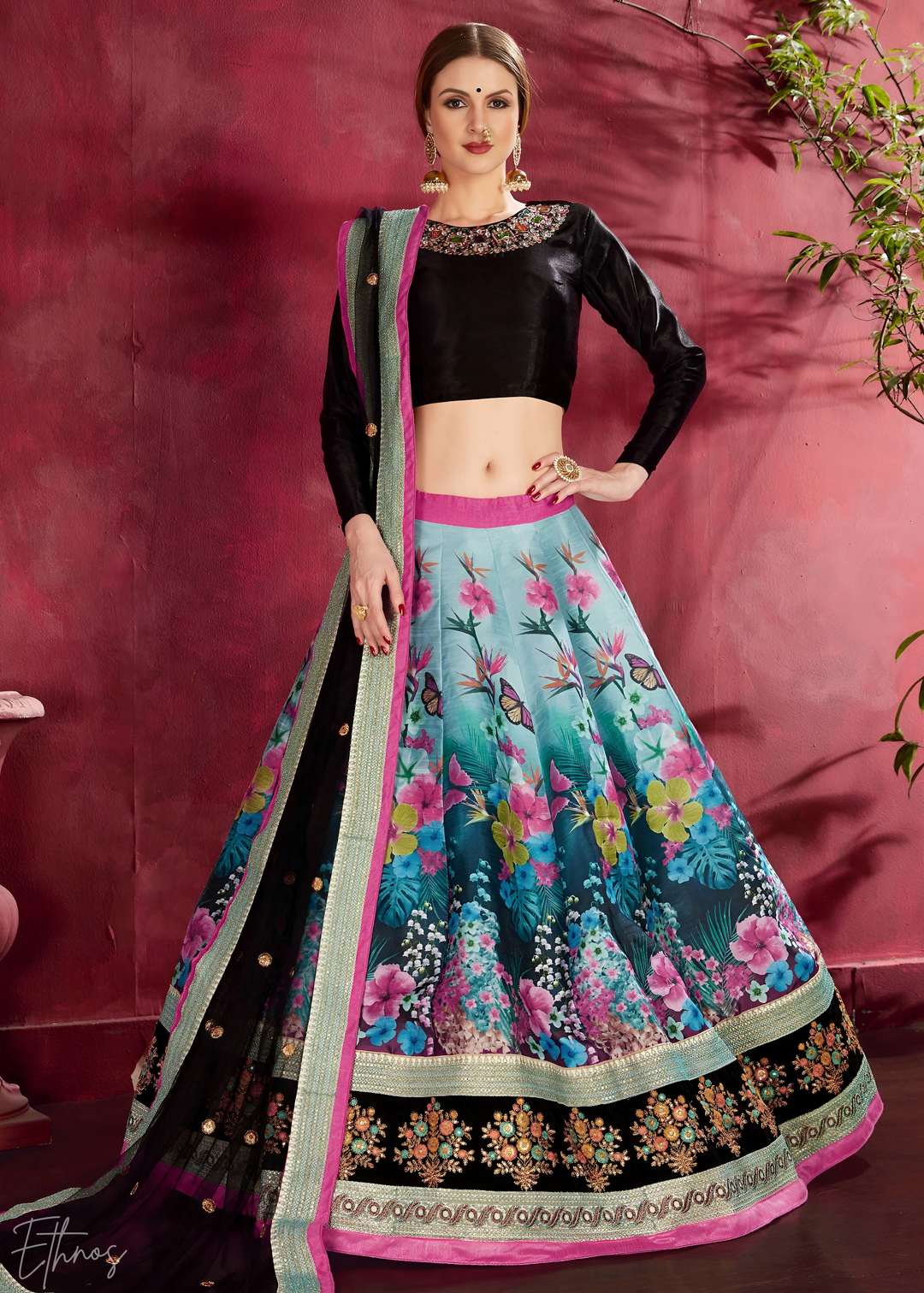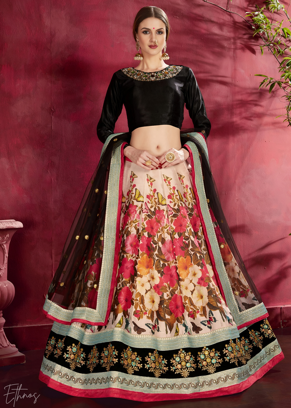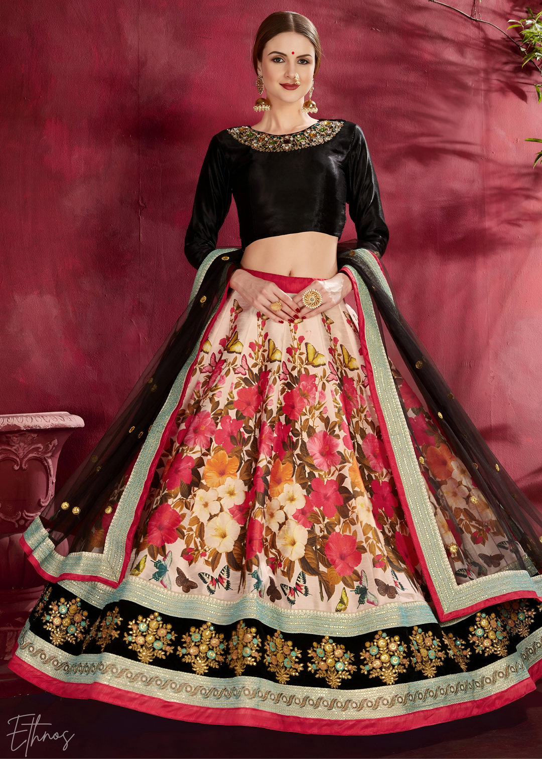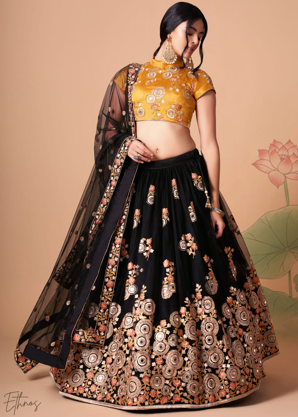 Black Opulent Floral Mirror Net Lehenga