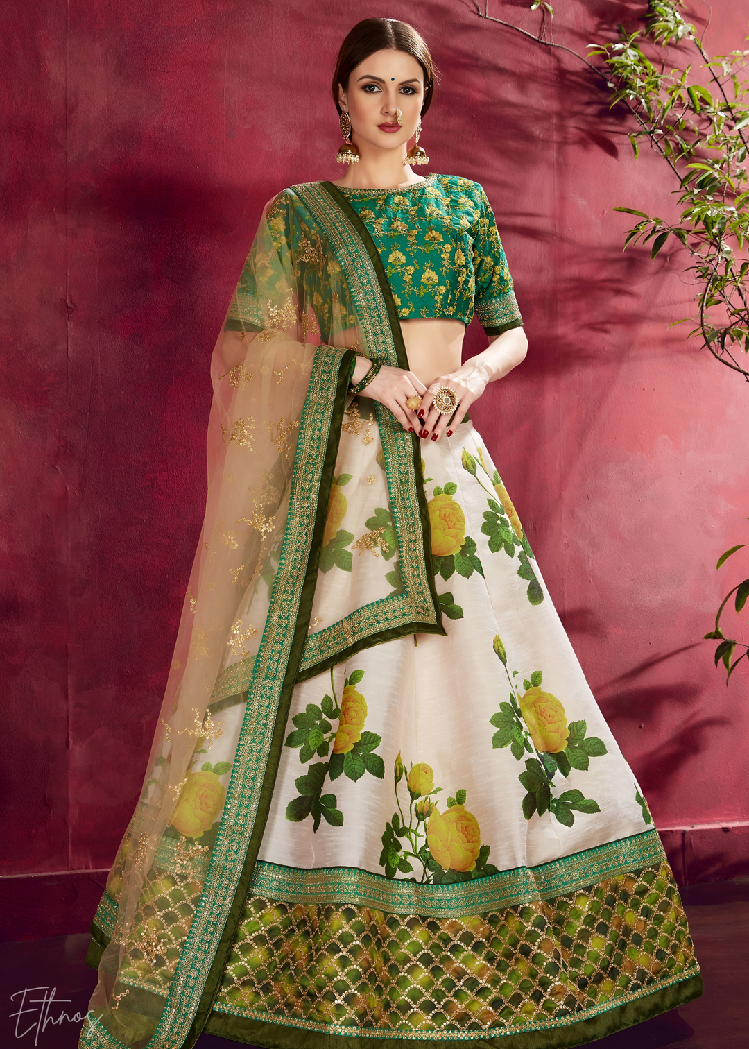 Cream & Emerald Zari Rose Silk Lehenga