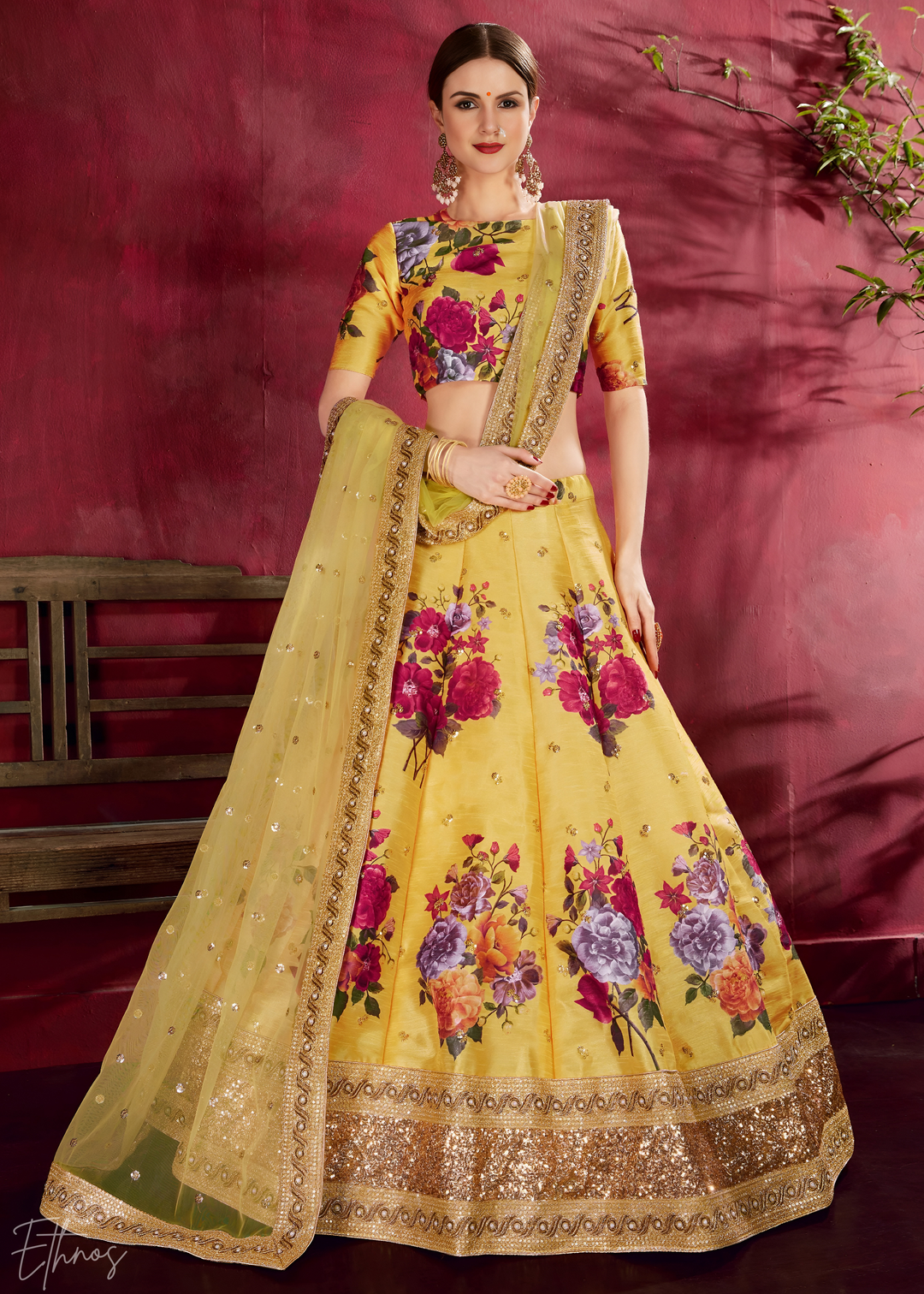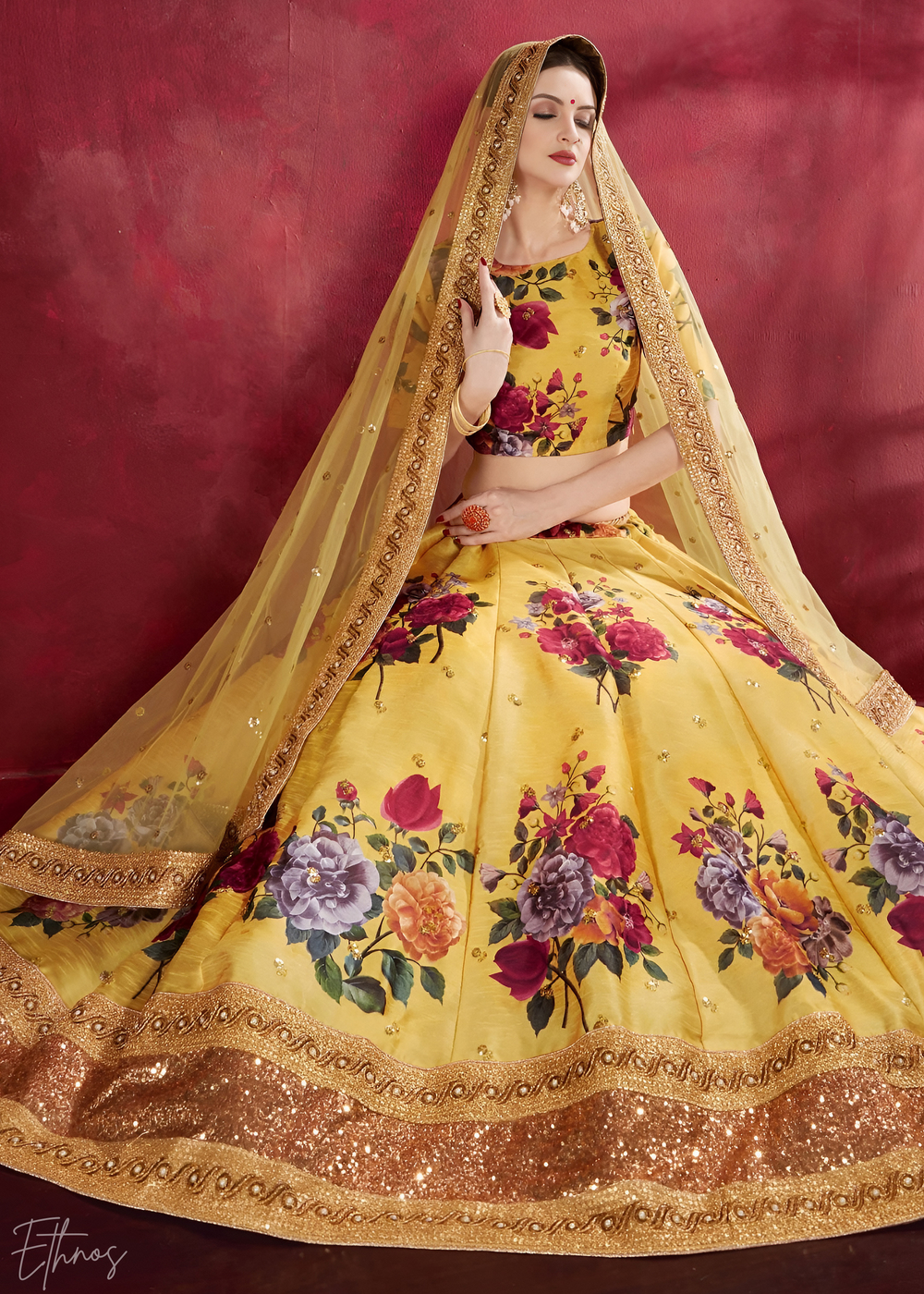 Mustard Opulent Floral Mirror Net Lehenga