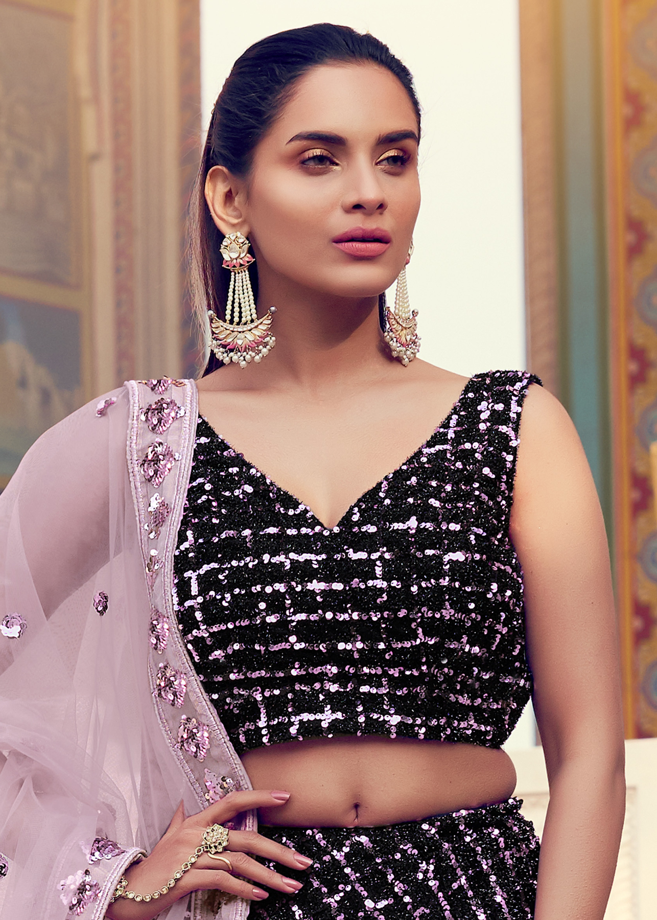 Stun everyone in this black and pink-toned designer lehenga choli enriched with sophisticated sequins work tendered around this. The embellishments give this product an eye-catching look. Team this sparkling piece with cocktail jewelry for parties and other celebrations and become the cynosure of all eyes.