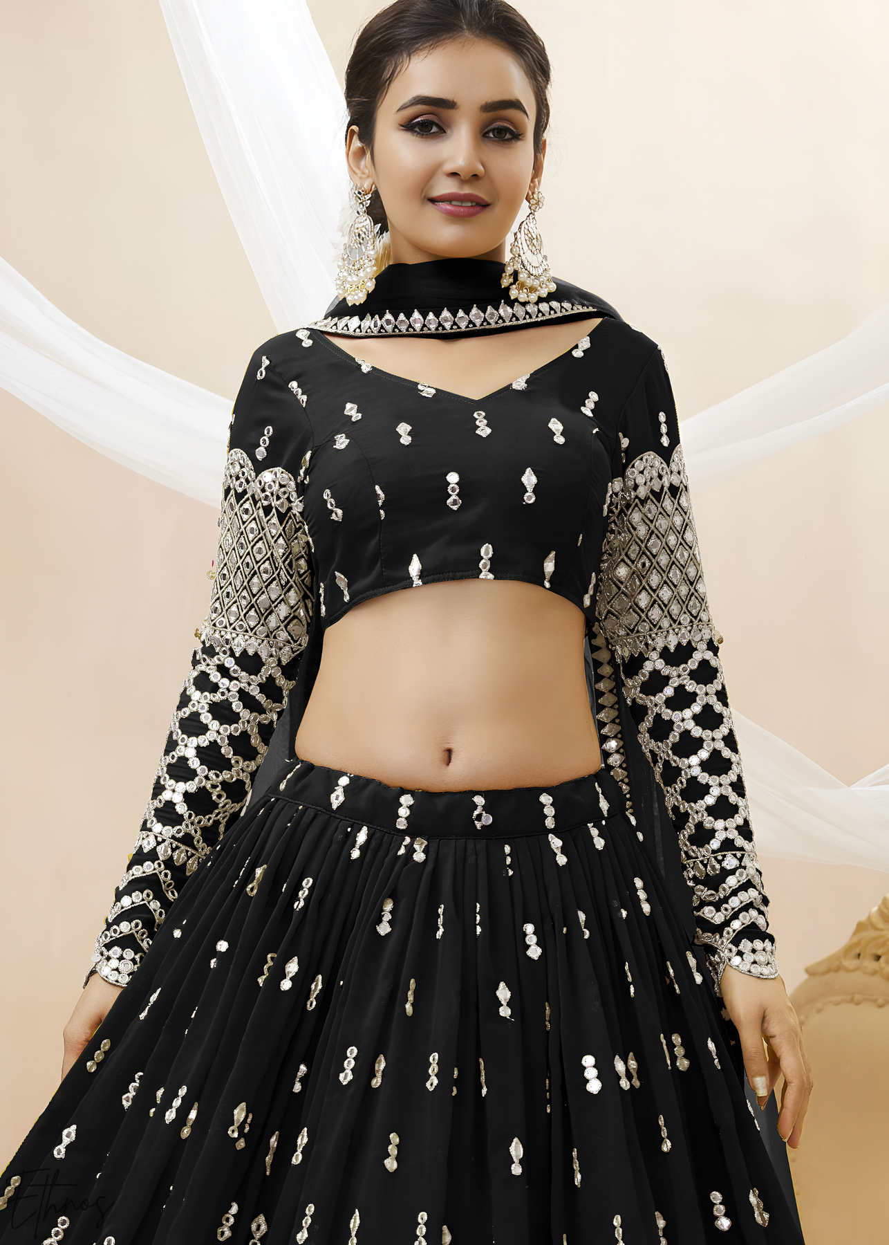 This black lehenga in premium georgette fabric is embellished with sequins and zari embroidery, paired with a blouse featuring matching detailing. A sheer soft-net dupatta with sequins and zari completes the ensemble with striking sophistication. Perfect for weddings, festive occasions, receptions, evening parties, and cultural celebrations.
