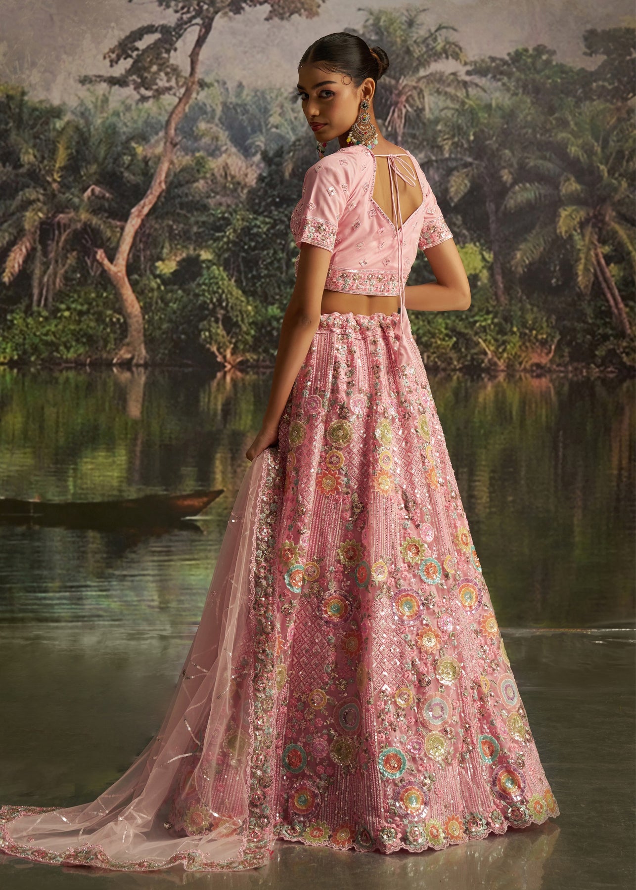 This Bright Pink Soft Net Lehenga set combines a vivid pink soft-net base with intricate multicolor floral embroidery, enhanced by striking zari, dori, thread, and sequin combinations—featuring subtle diamond-like accents that add a twinkle to the overall ensemble. It's tailored to suit celebrations like weddings, festive events, and bridesmaid outfits, offering a fresh and elegant twist on traditional Indian formal wear.