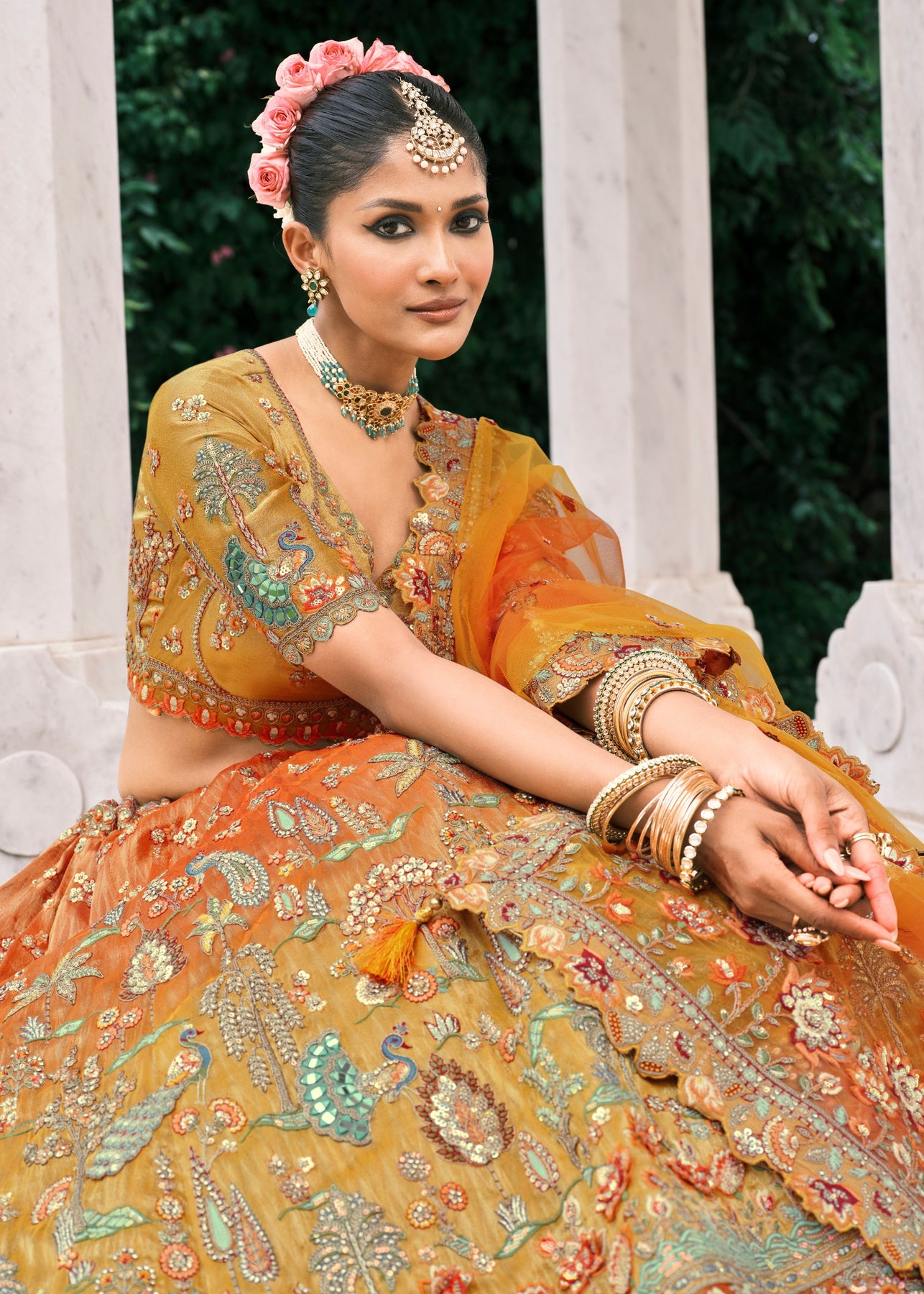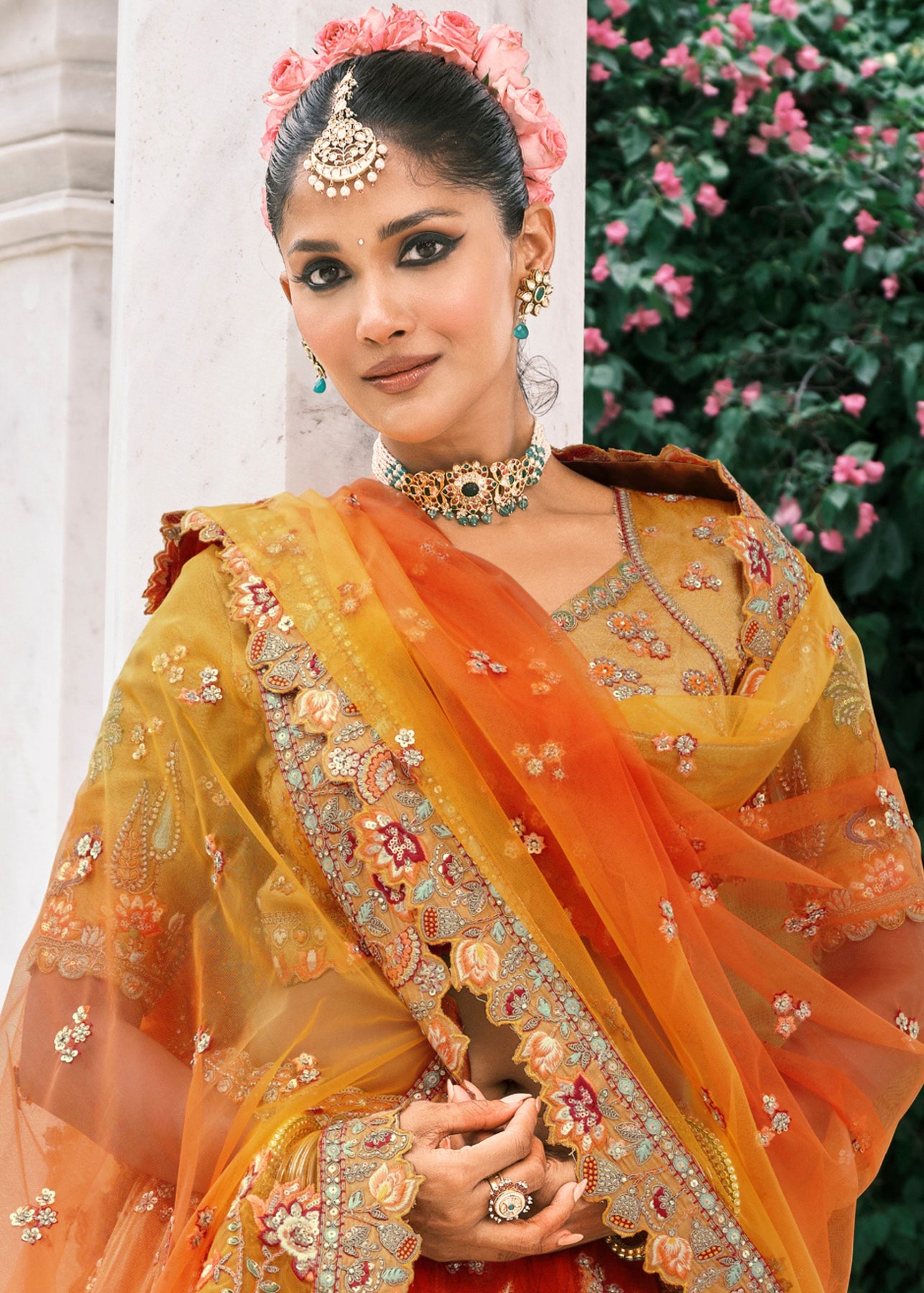 A vibrant cadmium orange silk lehenga choli set, richly adorned with delicate cut‑work embroidery and sparkling stone detailing. The flap‑border styling adds a graceful edge, blending tradition with modern flair. Crafted in blended silk for both the blouse and skirt, with a soft net dupatta to complement. A statement piece designed to shine at weddings, festivals or grand celebrations.