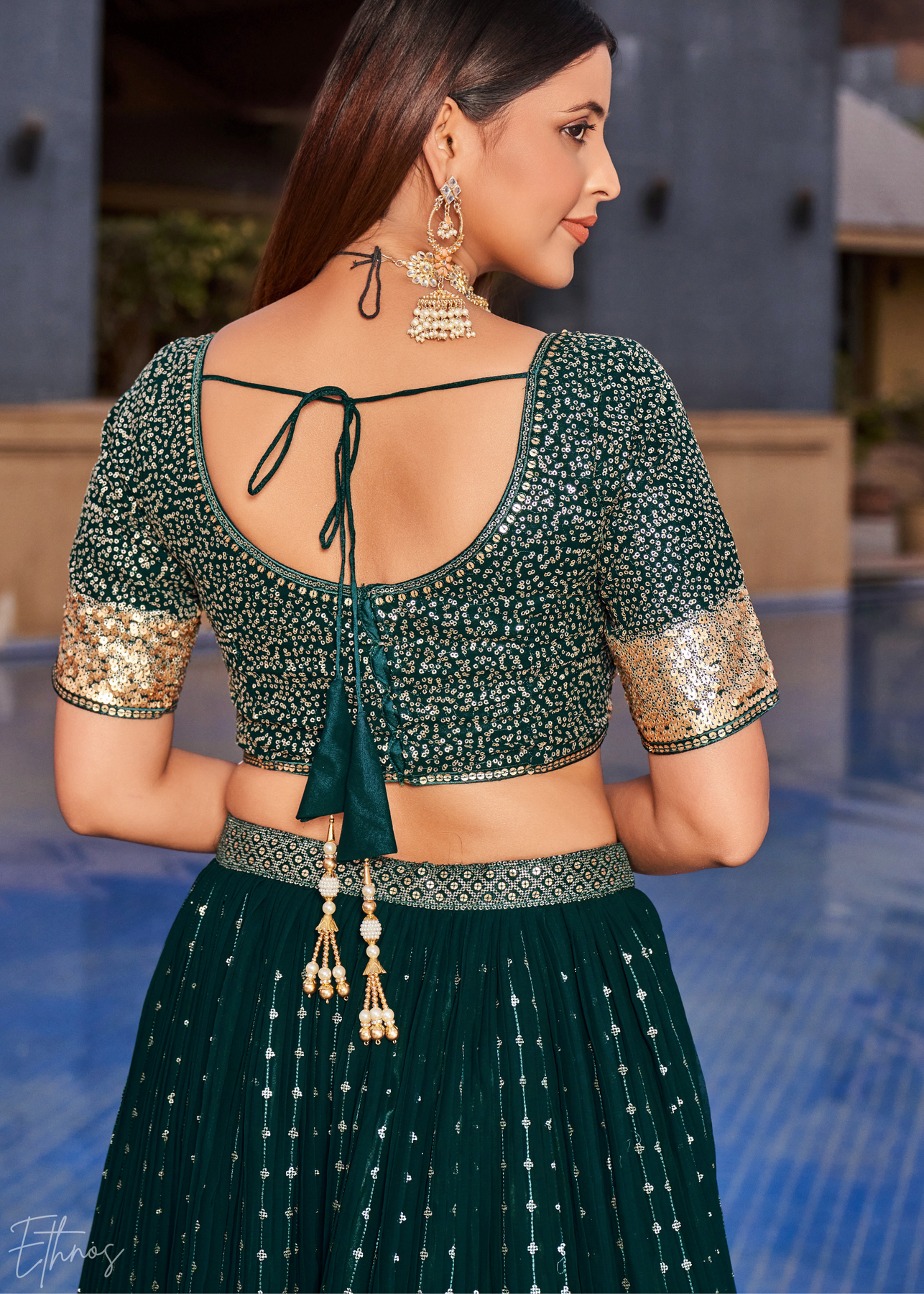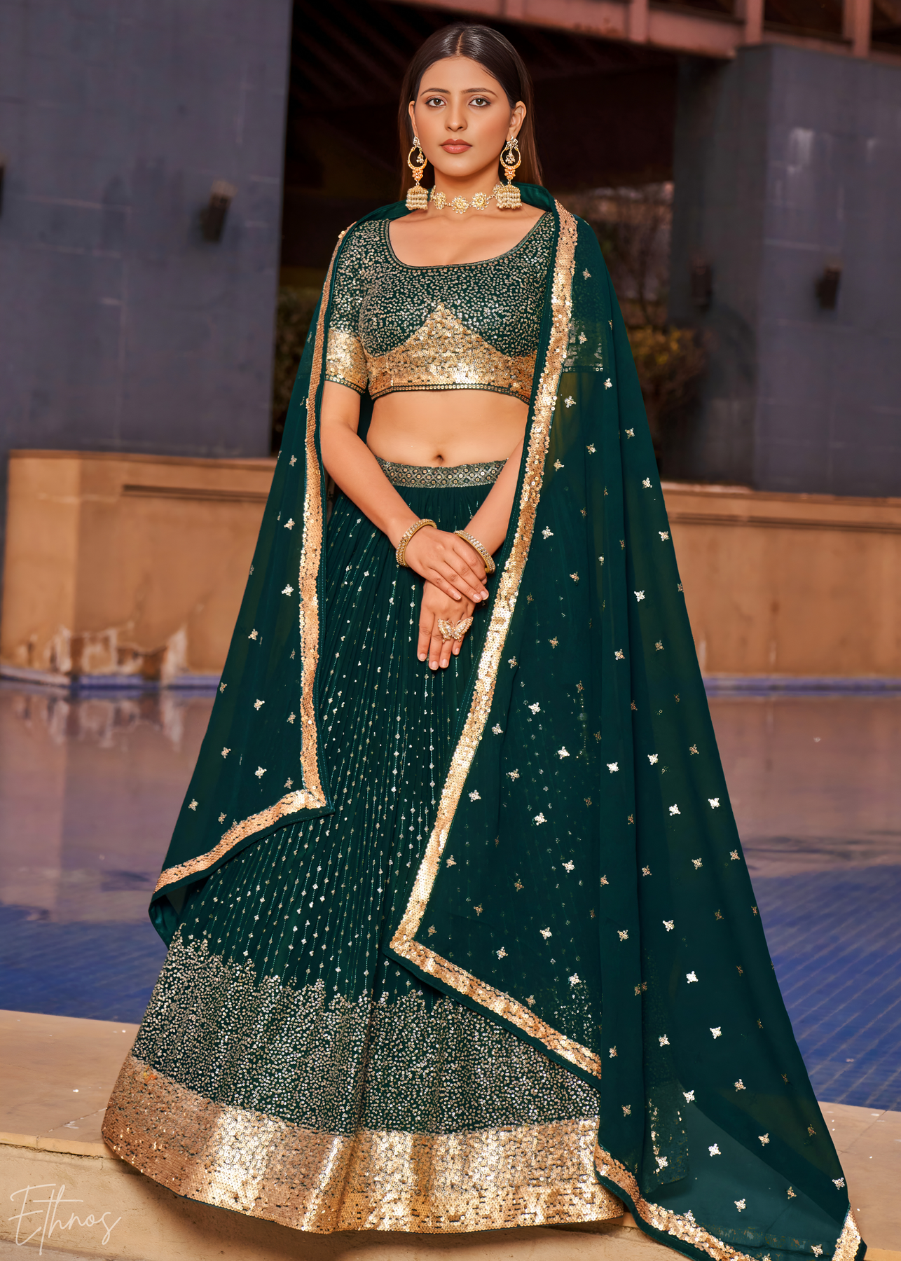 Deep Green Sequins Georgette Lehenga