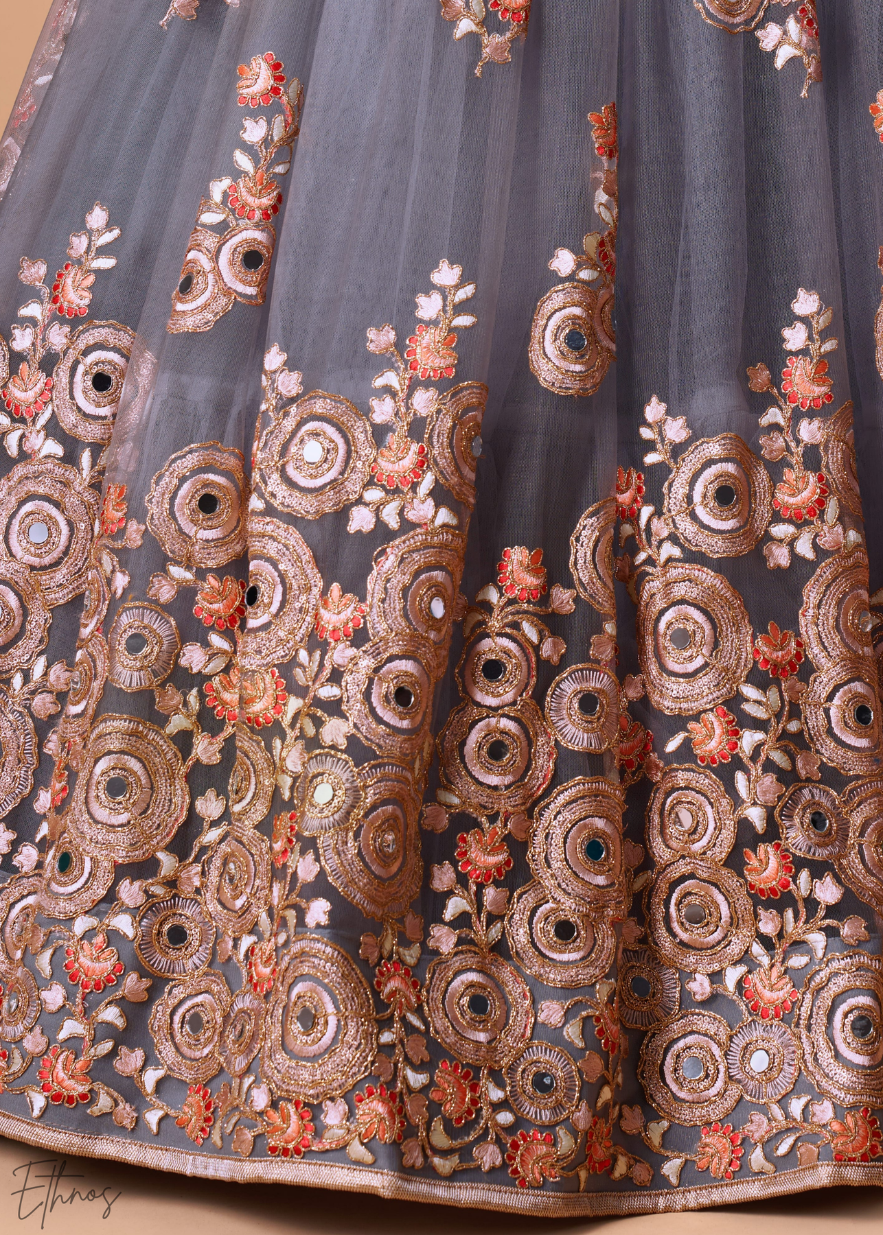 Grey Opulent Floral Mirror Net Lehenga