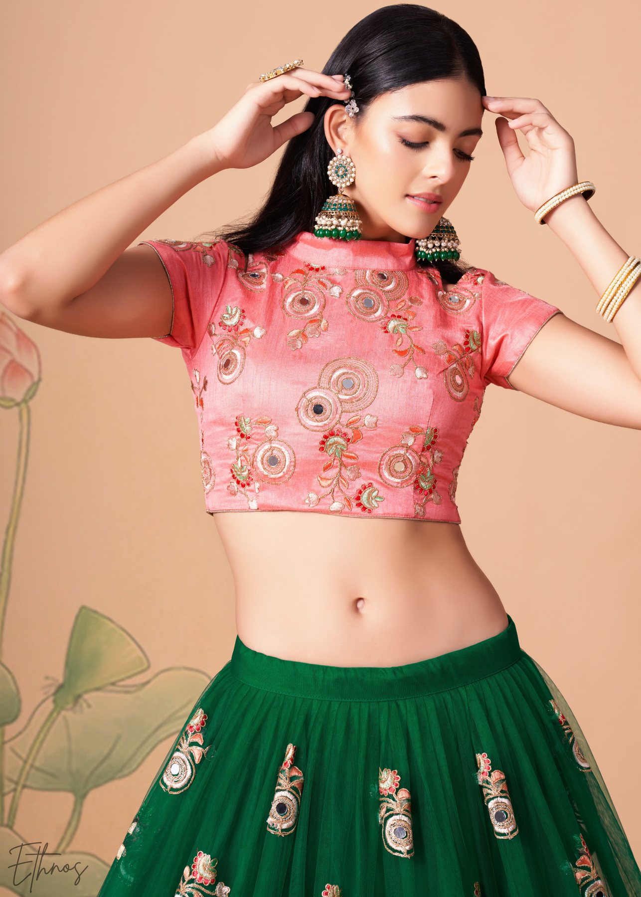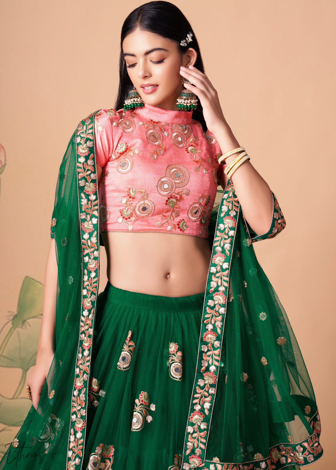 This elegant lehenga choli set is designed for festive occasions and wedding celebrations, featuring a striking contrast of deep emerald green and soft peach. It showcases a voluminous net lehenga and a matching dupatta, both richly adorned with intricate gold-toned embroidery, shimmering sequins, and traditional mirror work. It is paired with a blouse that features a classic high-neck design and complementary floral embellishments.