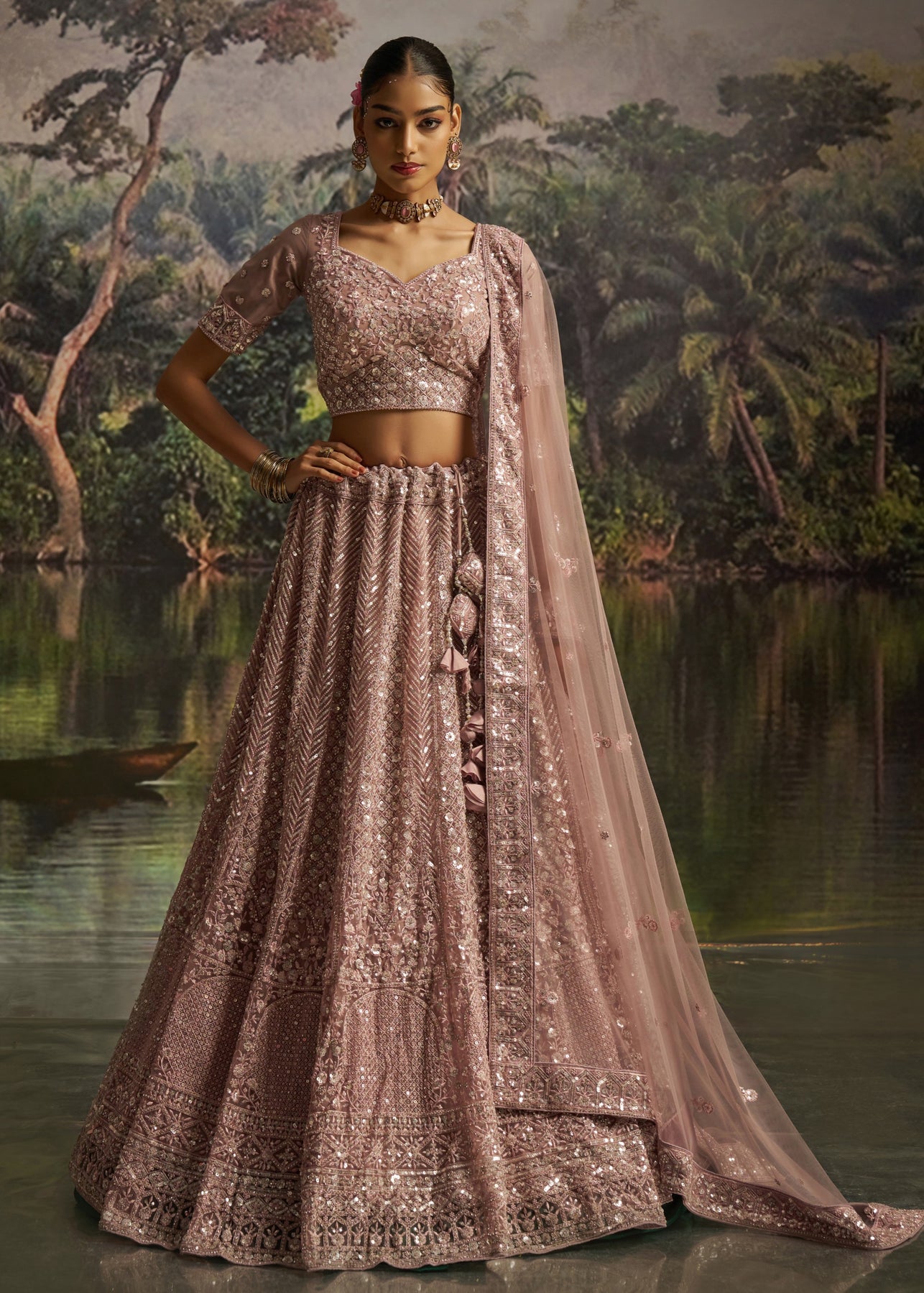 This Mauve-pink Soft Net Lehenga ensemble is crafted in a delicate crepe-pink soft net fabric that falls gracefully, creating an ethereal, flowy silhouette. Its circular lehenga with approximately 3 meters of ghera offers a voluminous yet lightweight appearance. The blush hue gives it a romantic, pastel allure. The outfit is intricately detailed with thread embroidery enhanced by small pearl accents, imparting a refined and elegant sparkle.