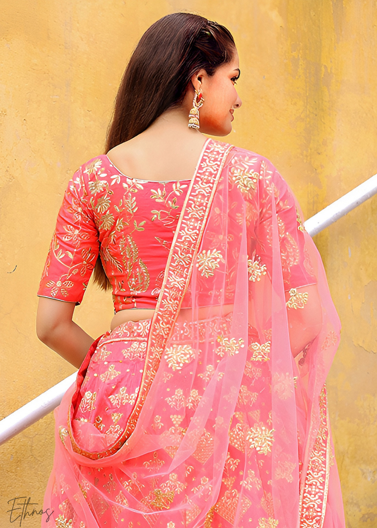 The peach-pink lehenga is made from elegant slub silk, giving it a soft texture and graceful fall ideal for festive and wedding occasions. A lightweight soft net dupatta complements the silk skirt and blouse, adding delicate balance to the outfit. This ensemble blends classic ethnic charm with a pastel colour palette, making it perfect for celebrations and special events.