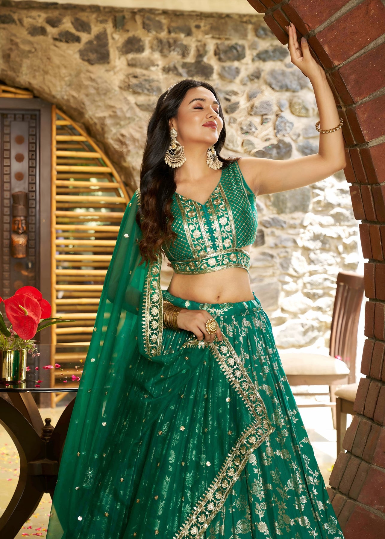 Rama Green Sequins and Zari Embroidery Work Silk Lehenga