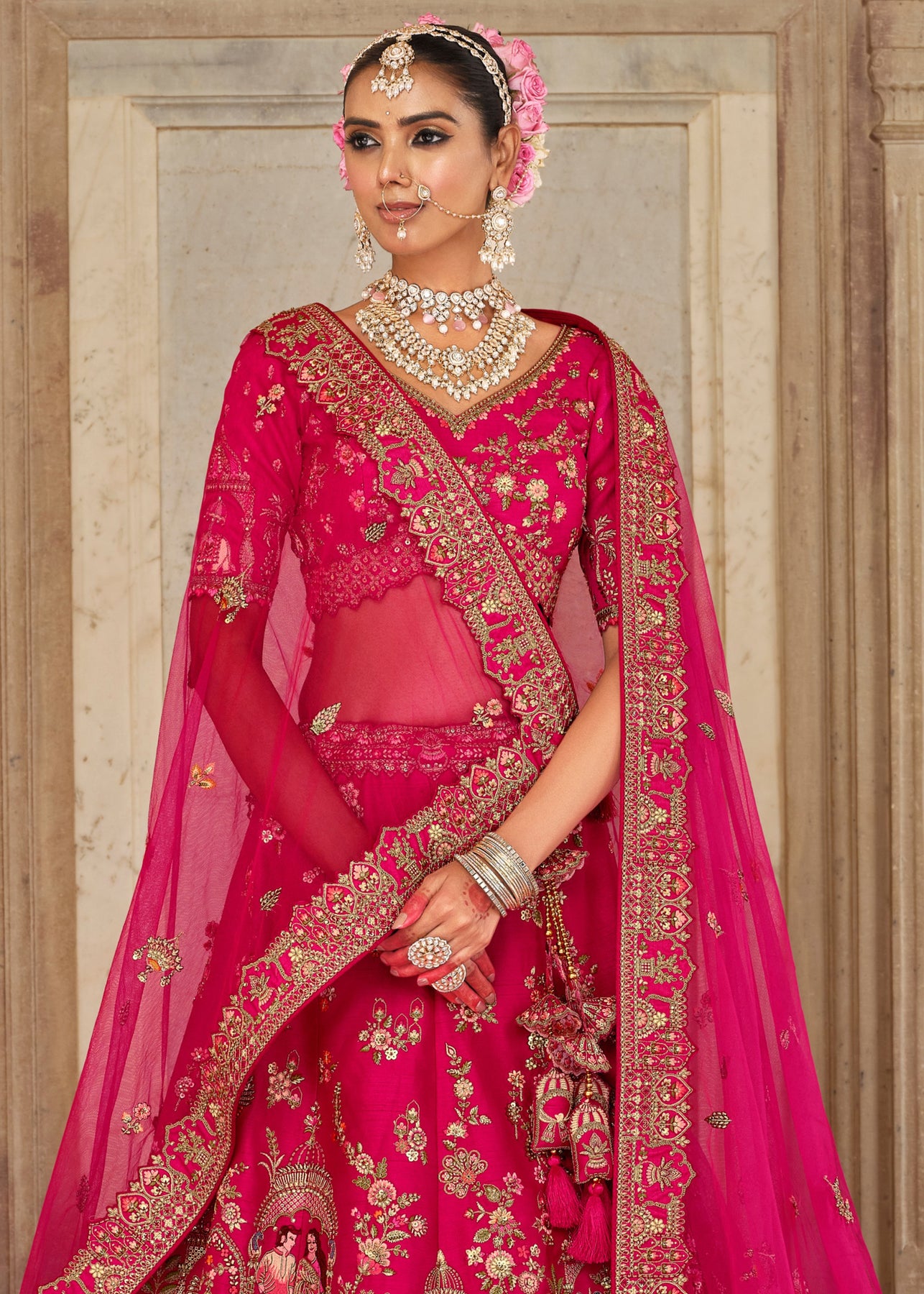 Raspberry Pink Heavy Bridal Silk Lehenga With Khatli And Embroidery Work