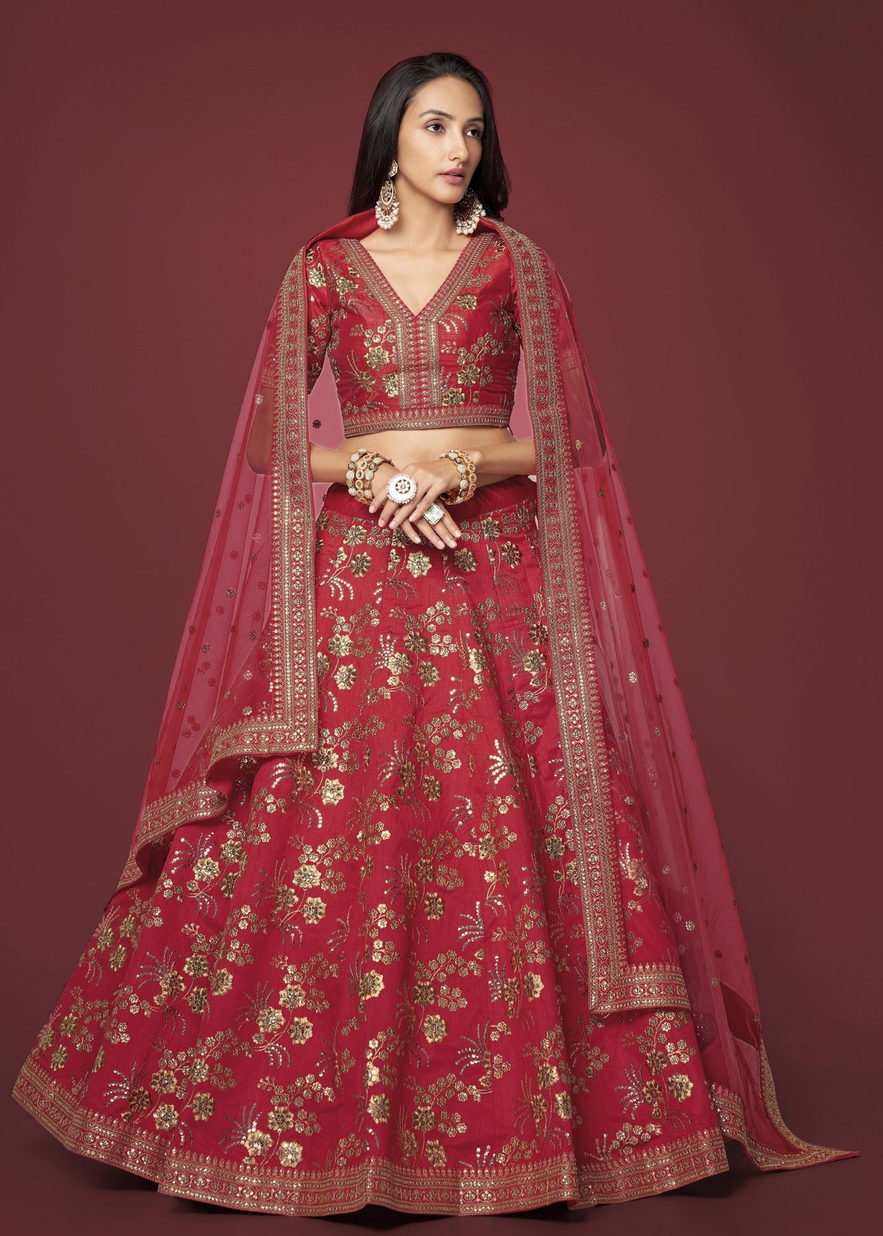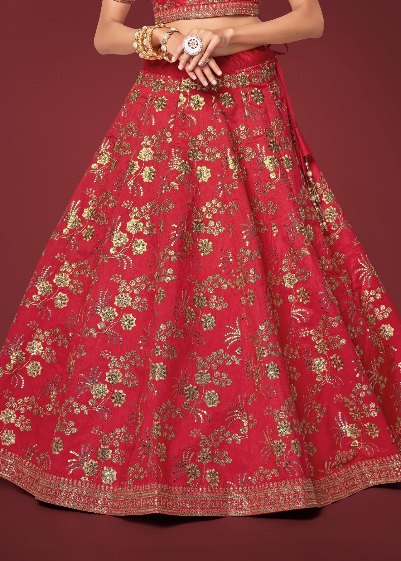 Red Slub Silk Lehenga with Zari Sequins and Dori Embroidery Work