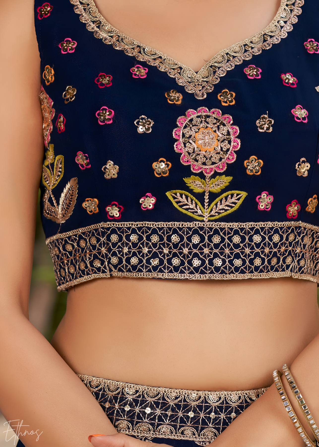 Blouse: Georgette with sequins, zari & mirror embroidery.