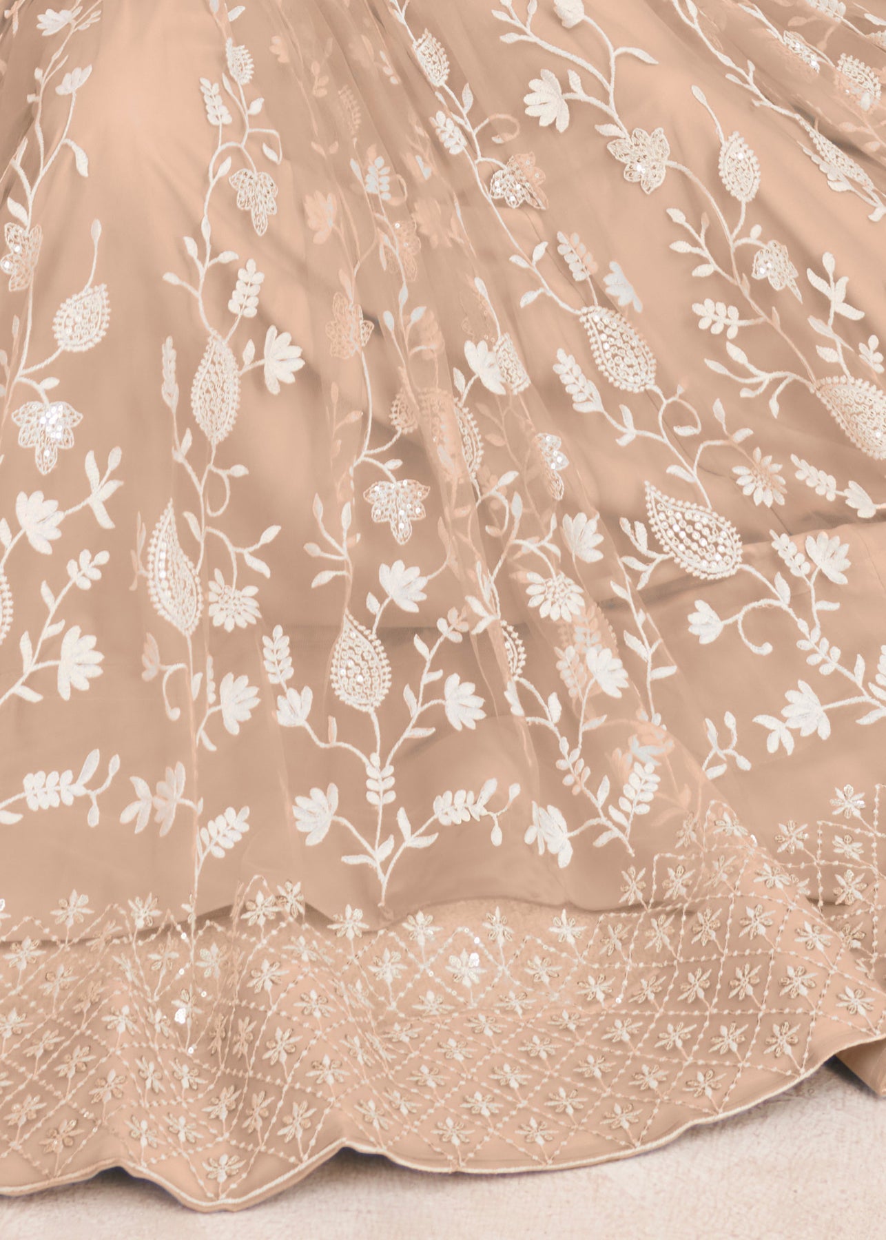 Sand Brown Designer Soft Net Lehenga With Cotton Thread And Sequins Embroidery Work