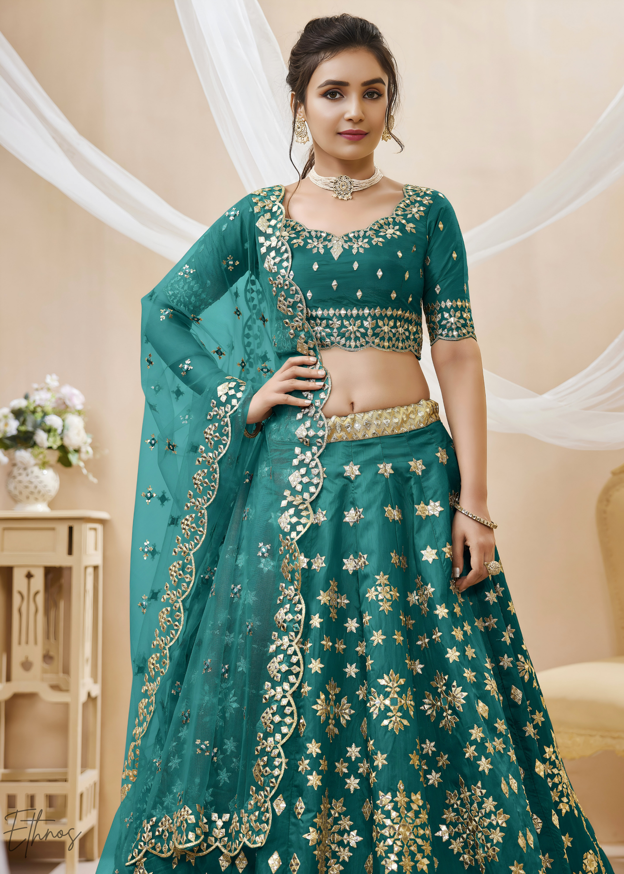 This teal green lehenga in premium art silk dazzles with sequins, foil, and zari embroidery, paired with a matching blouse adorned in foil and zari embellishments. The sheer soft-net dupatta, edged with a scalloped gold border and sparkling with sequins and zari, completes the ensemble with regal elegance for weddings and festive occasions.
