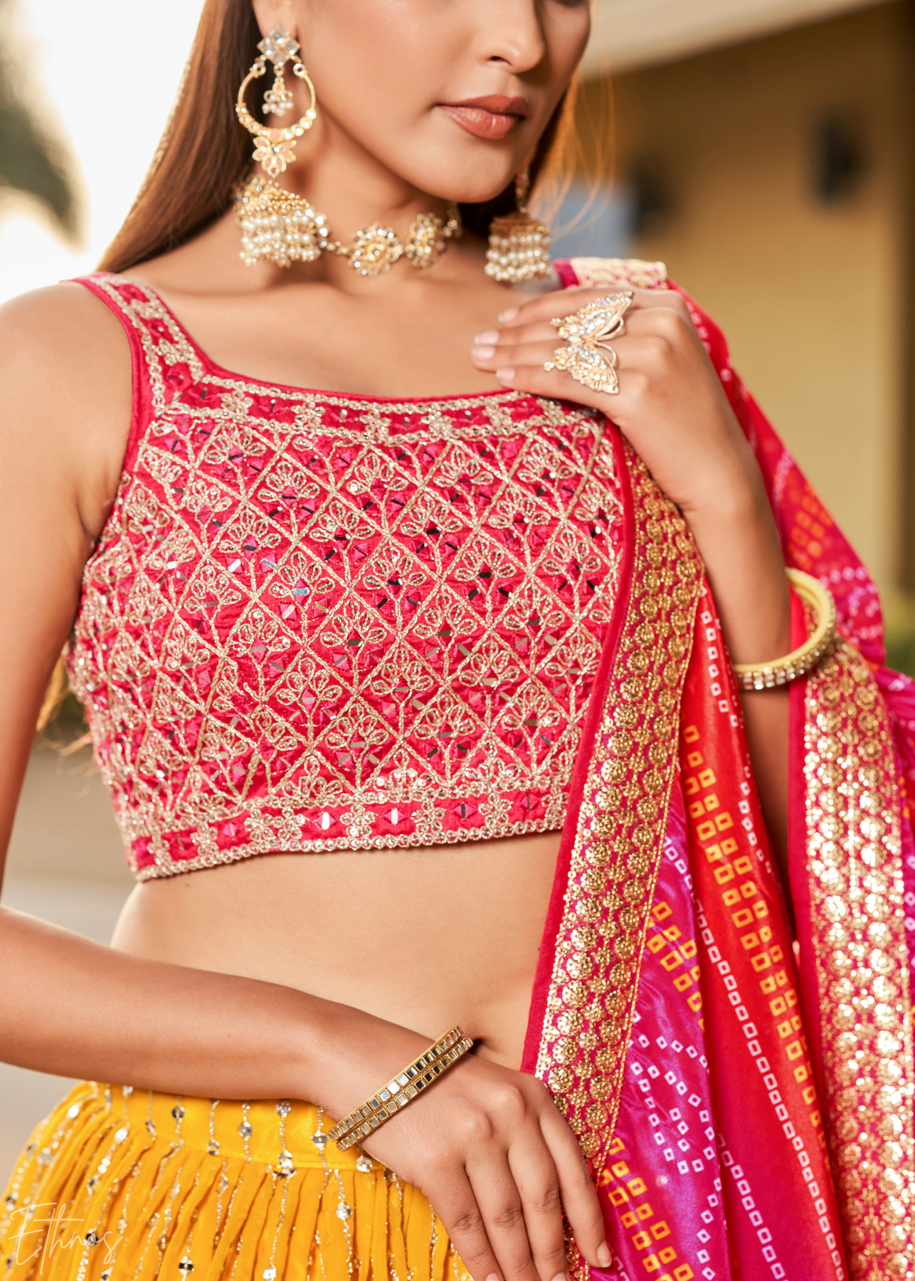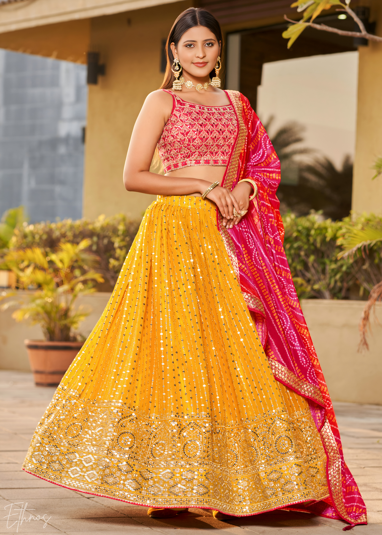 This vibrant yellow lehenga features an all-over intricate sequin and zari embroidery pattern, including elegant vertical lines on the skirt and mirror work accents. The blouse & duppatta in contrasting pink adds a classic touch. This beautiful, flowy lehenga set is an ideal choice for weddings, haldi ceremonies, parties, or other special occasions.