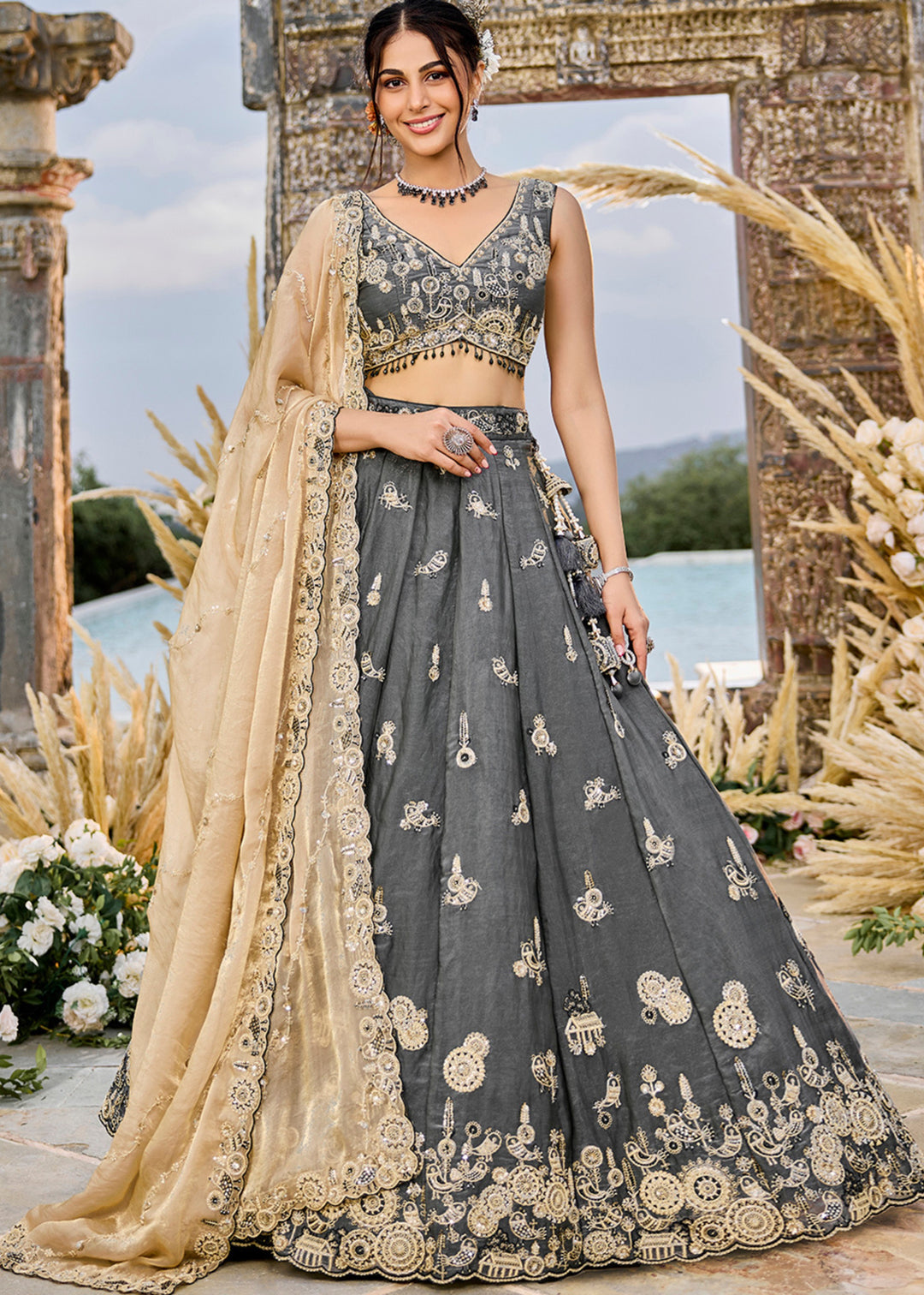 Grey Tissue Lehenga Choli with Sequinned Embroidered