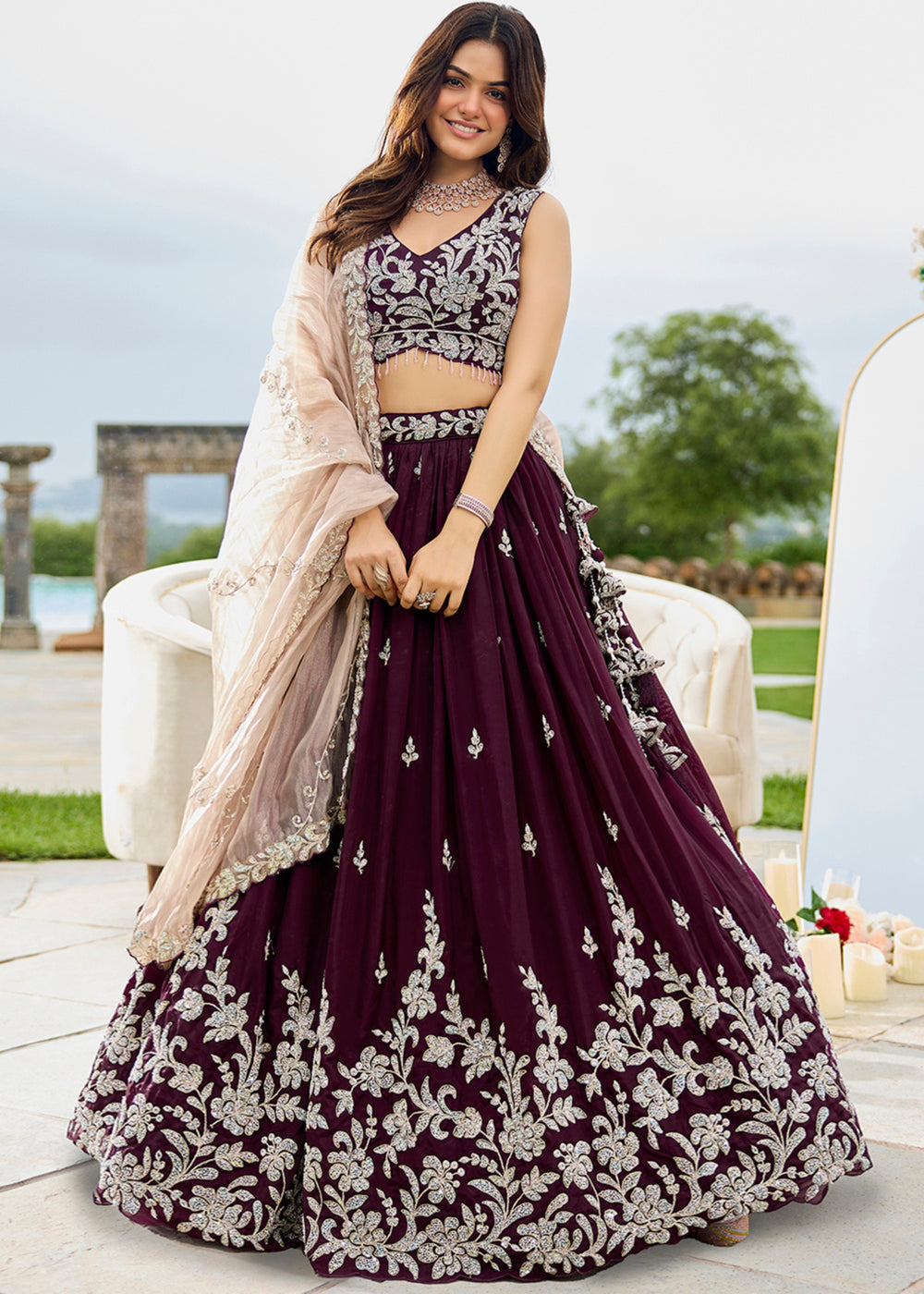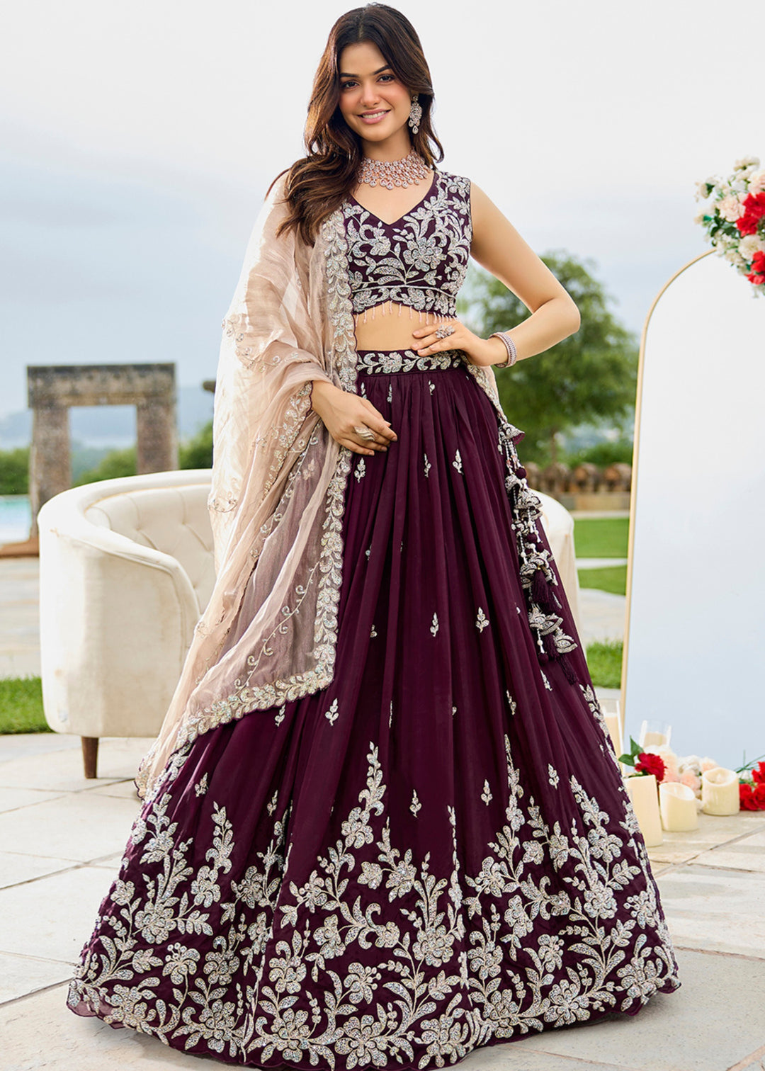 Wine Sequins and Zari Embroidery Work Silk Lehenga