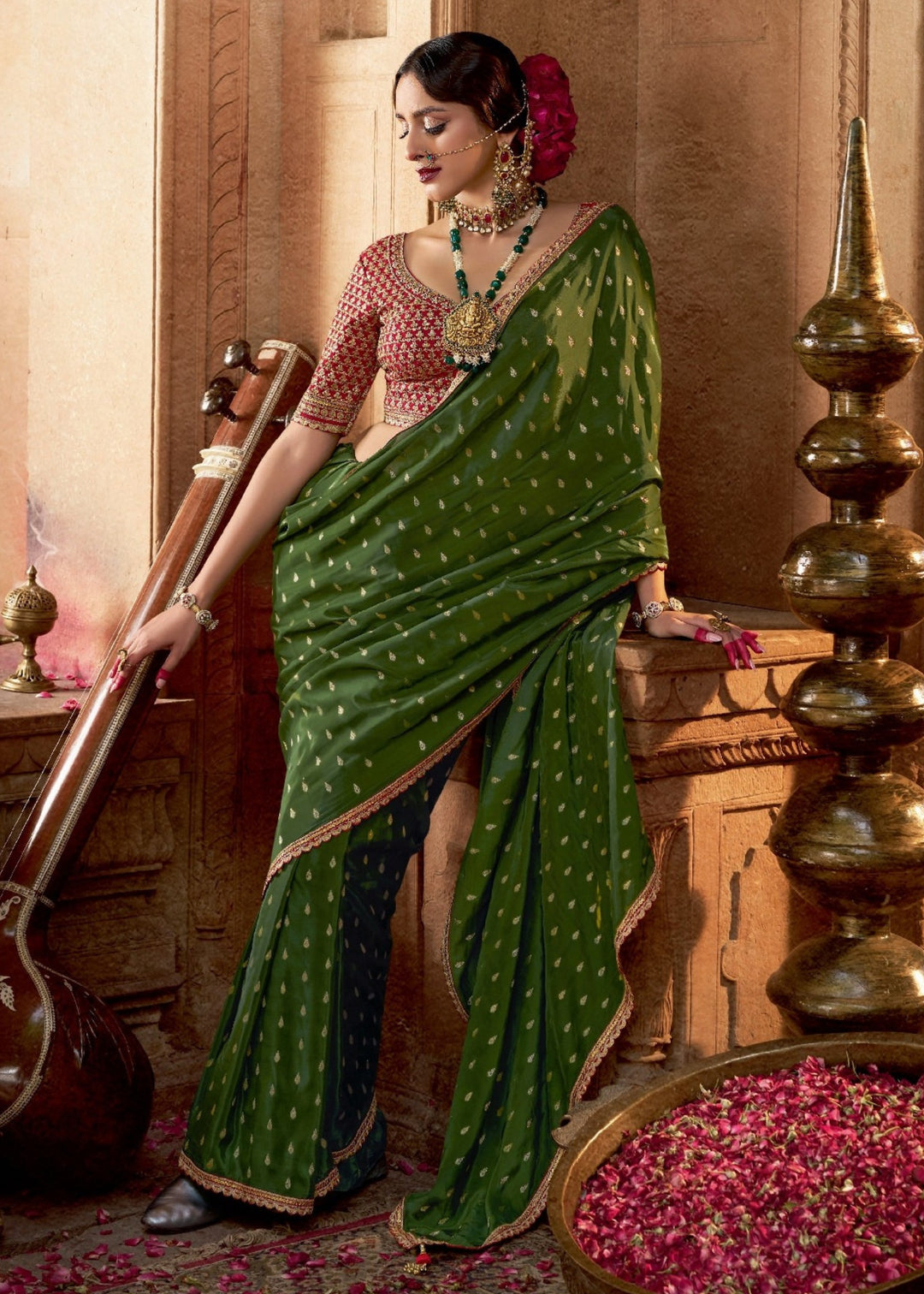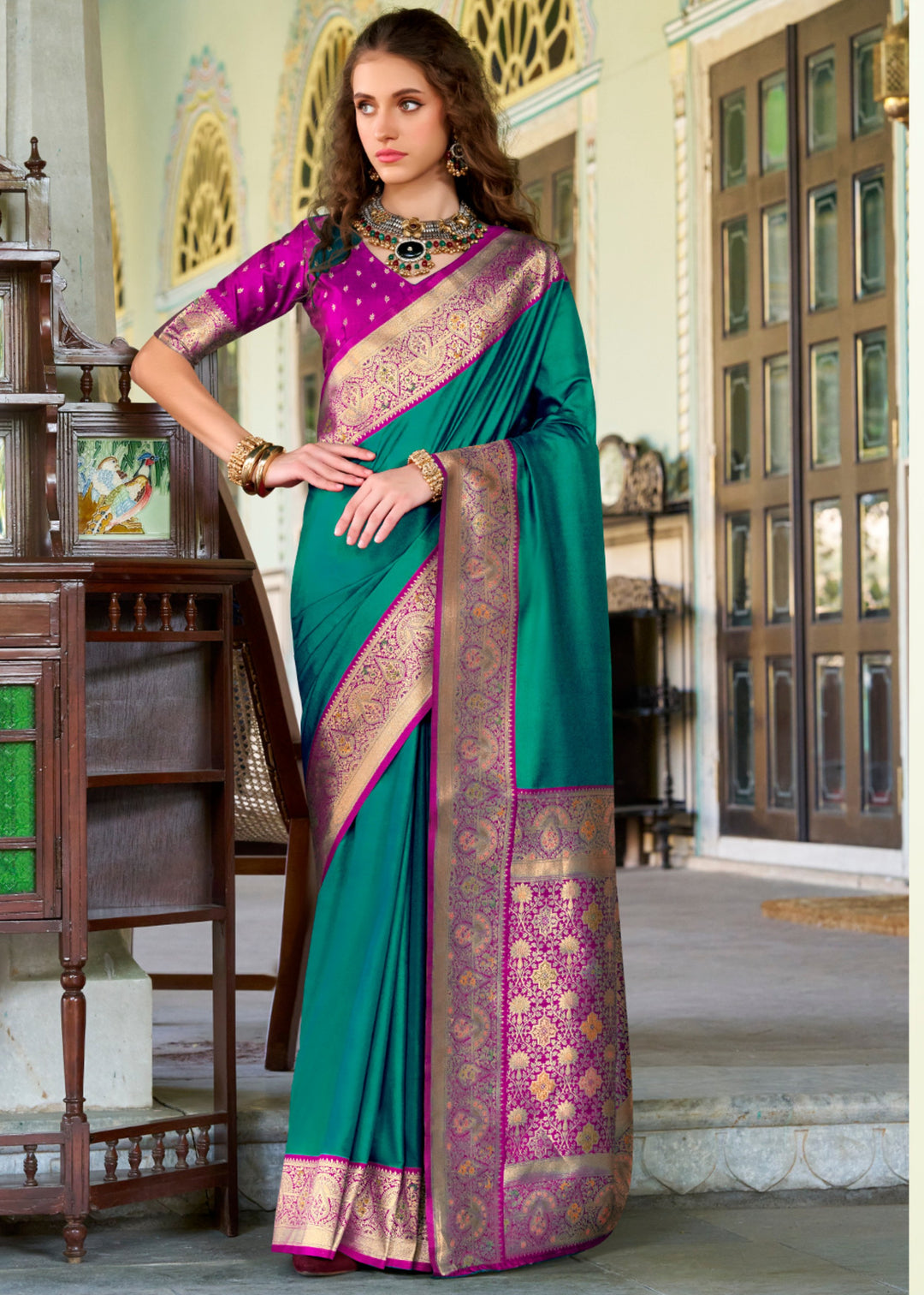 Sea Green Pure Viscose Dola Silk Saree with Zari Weaving & Embroidered Blouse