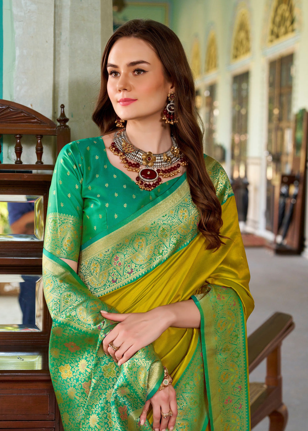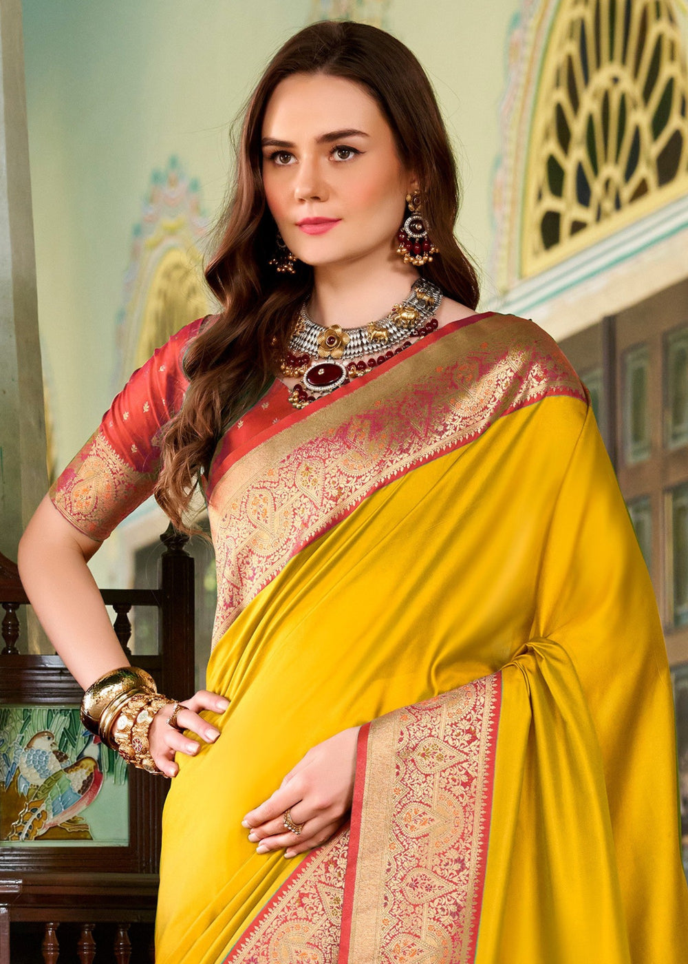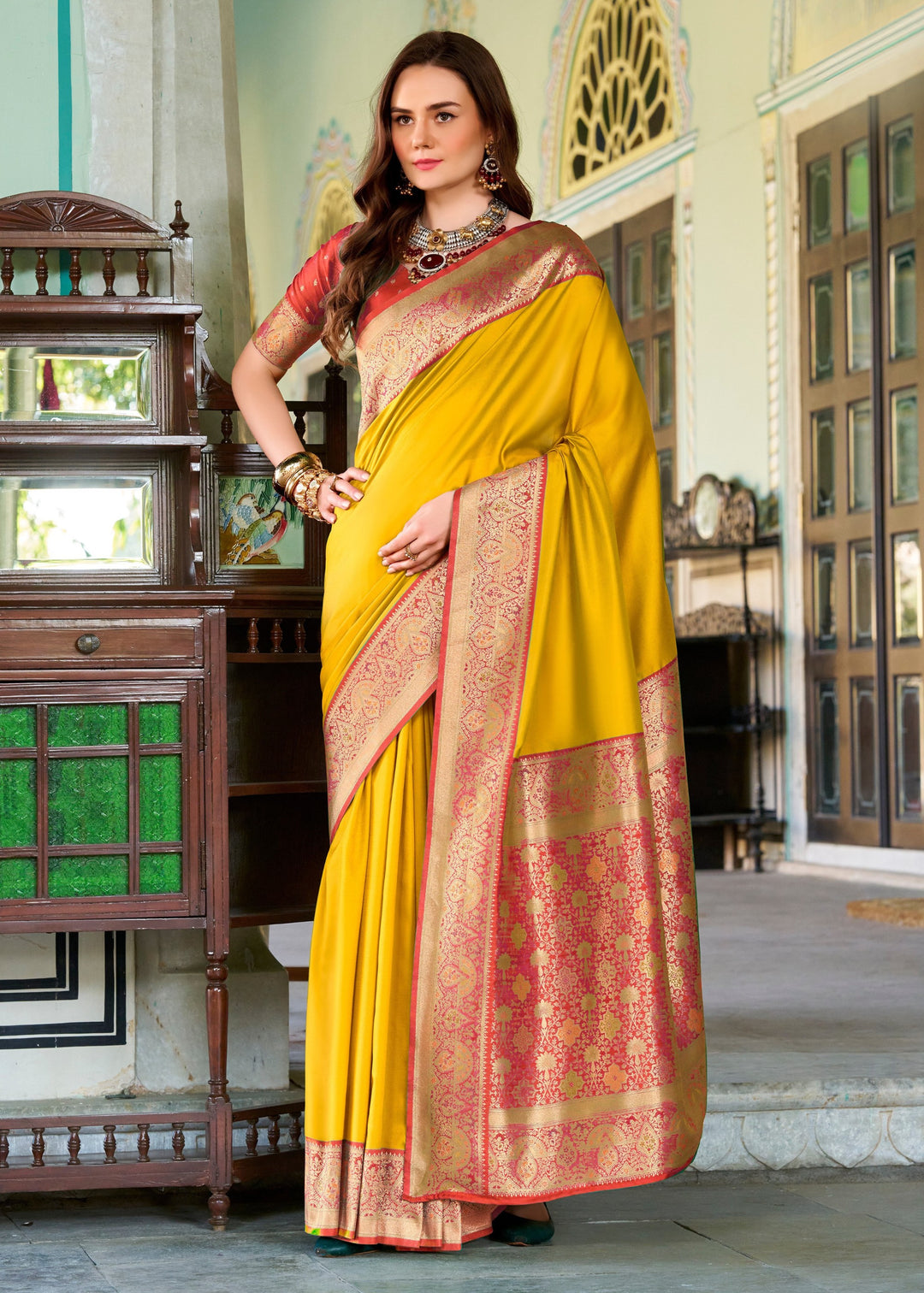 Golden Yellow Pure Viscose Dola Silk Saree with Zari Weaving & Embroidered Blouse