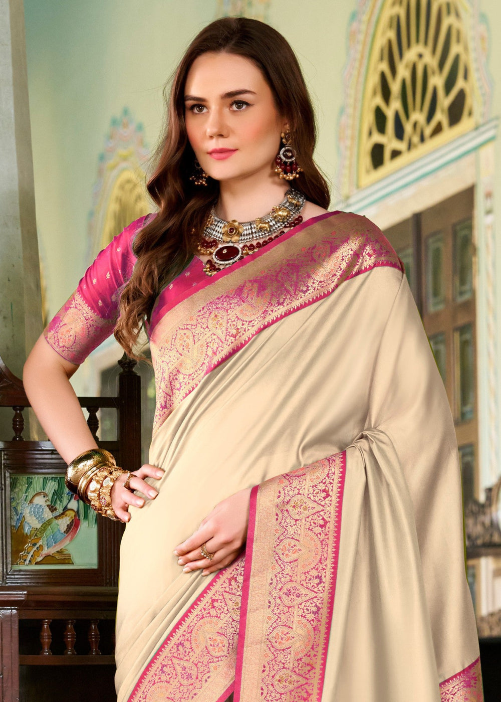 Pastel Cream with Peach-Pink floral border Silk Saree