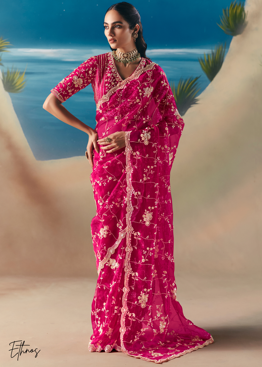Hot Pink Sequins Organza Saree