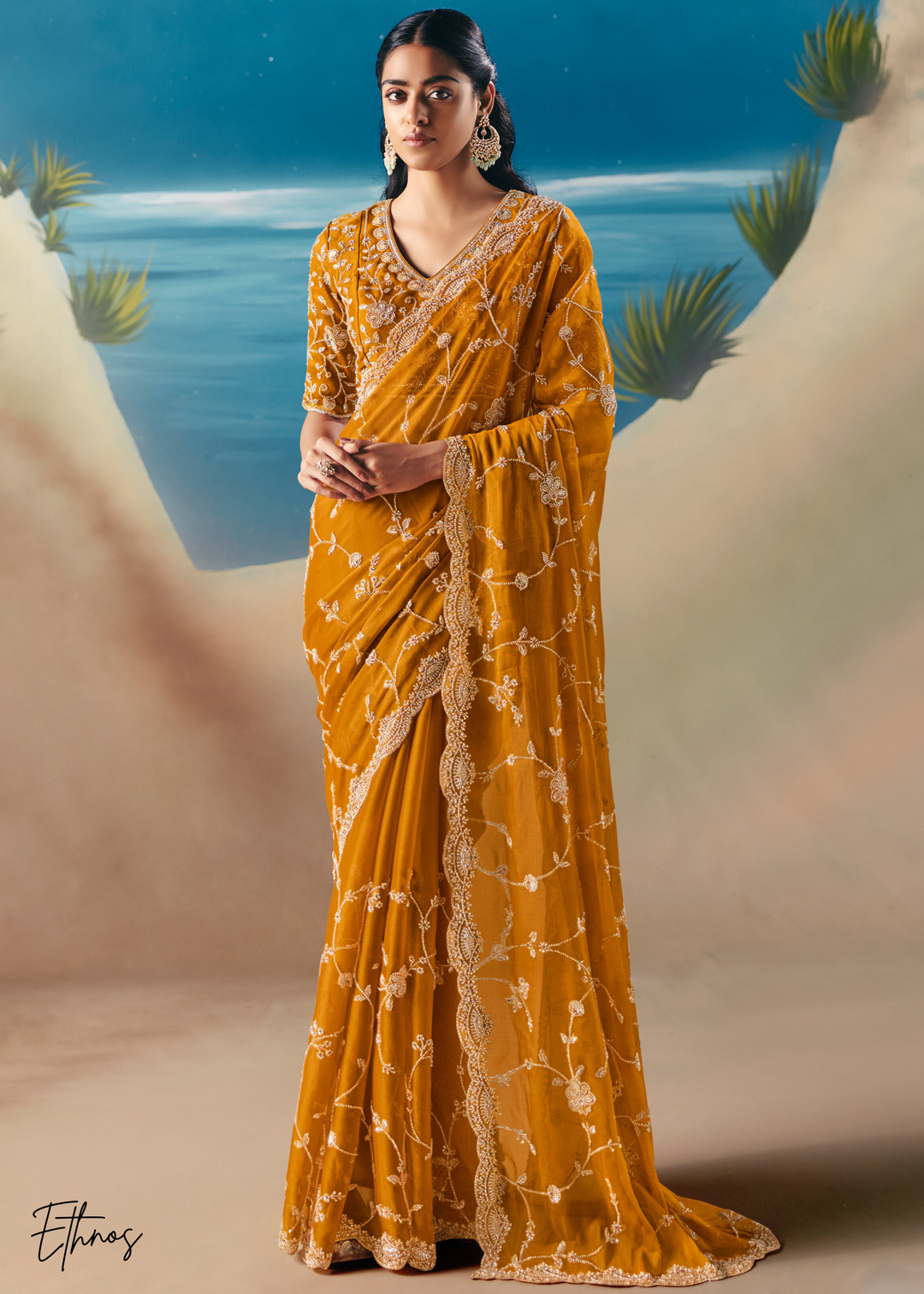 Mustard Sequins Organza Saree