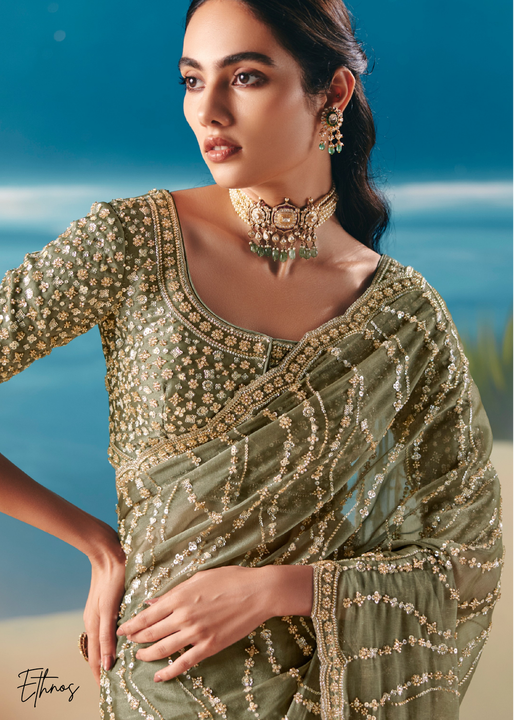 Olive Green Sequins Organza Saree