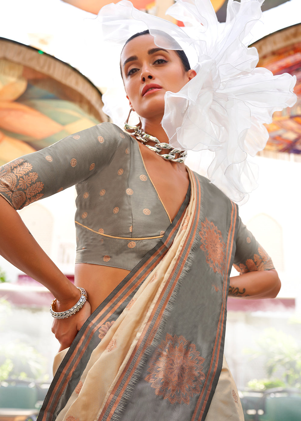 Beige Brown & Grey Handloom Woven katan Silk Saree