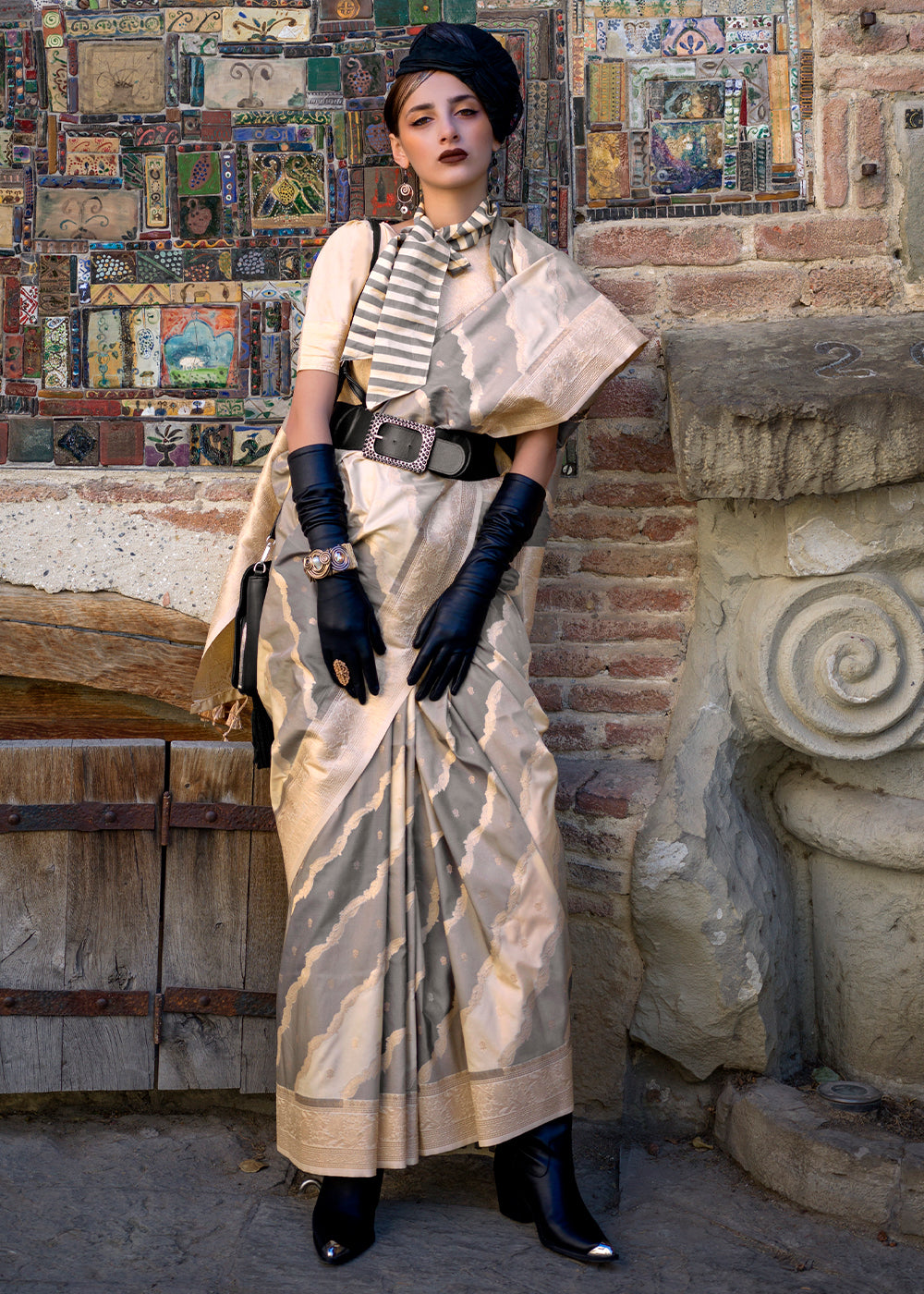 Beige Brown & Grey Rangkaat Handoom Woven Katan Silk Saree