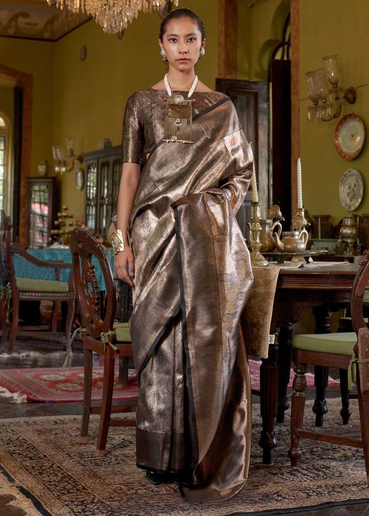 The **Copper Pure Handloom Dharmavaram Weaving Silk Saree** is more than an outfit—it’s a canvas of South Indian heritage, woven with precision, patience, and pride. Every thread is hand-drawn on traditional pit looms by skilled artisans of Dharmavaram, a weaving town whose silk mastery has been celebrated for centuries. The copper-toned base shimmers with a lustrous sheen, while the intricate zari borders and pallu add an opulent glow, reflecting temple-inspired artistry and floral grandeur.