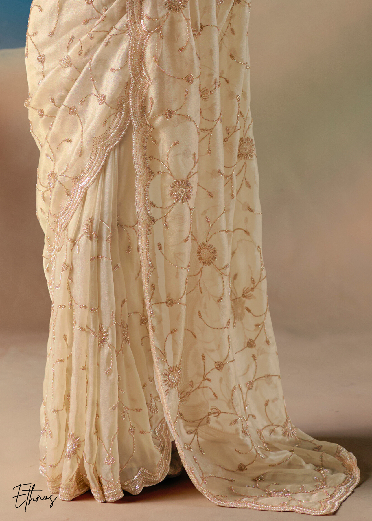 Embody understated grandeur in this Cream Organza Saree, elevated by intricate floral embroidery in shimmering sequins and pearls. The lustrous fabric drapes with an ethereal lightness, allowing the delicate embellishments to define its graceful silhouette. A timeless piece that offers refined elegance for discerning celebrations, blending soft sophistication with opulent artistry.