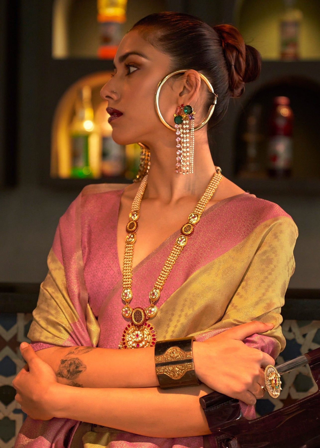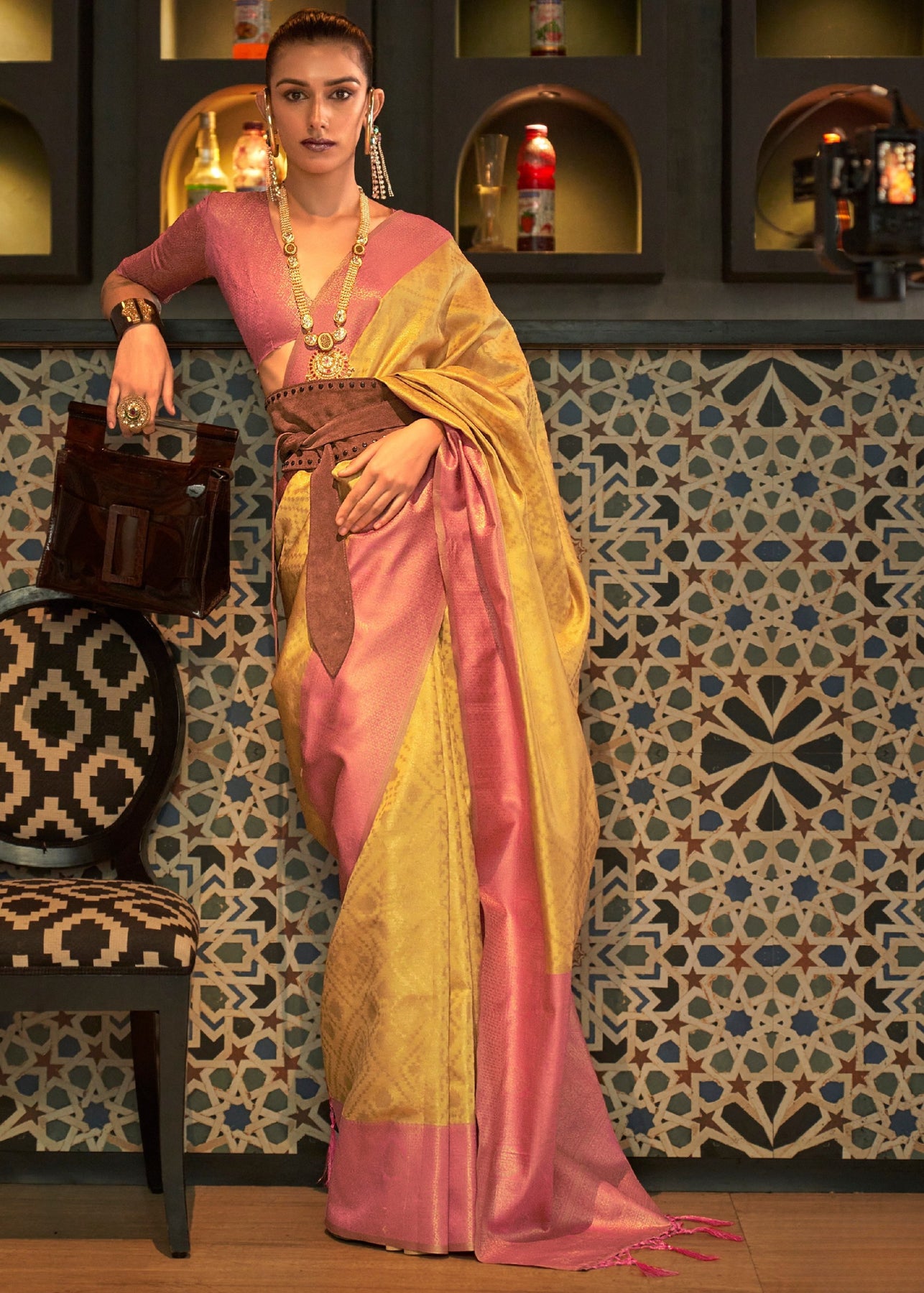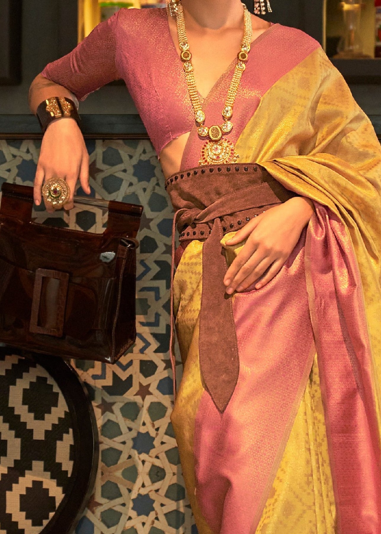 Dandelion Yellow and Flamingo Pink Silk Zari Base Chaap Handloom Weaving Saree