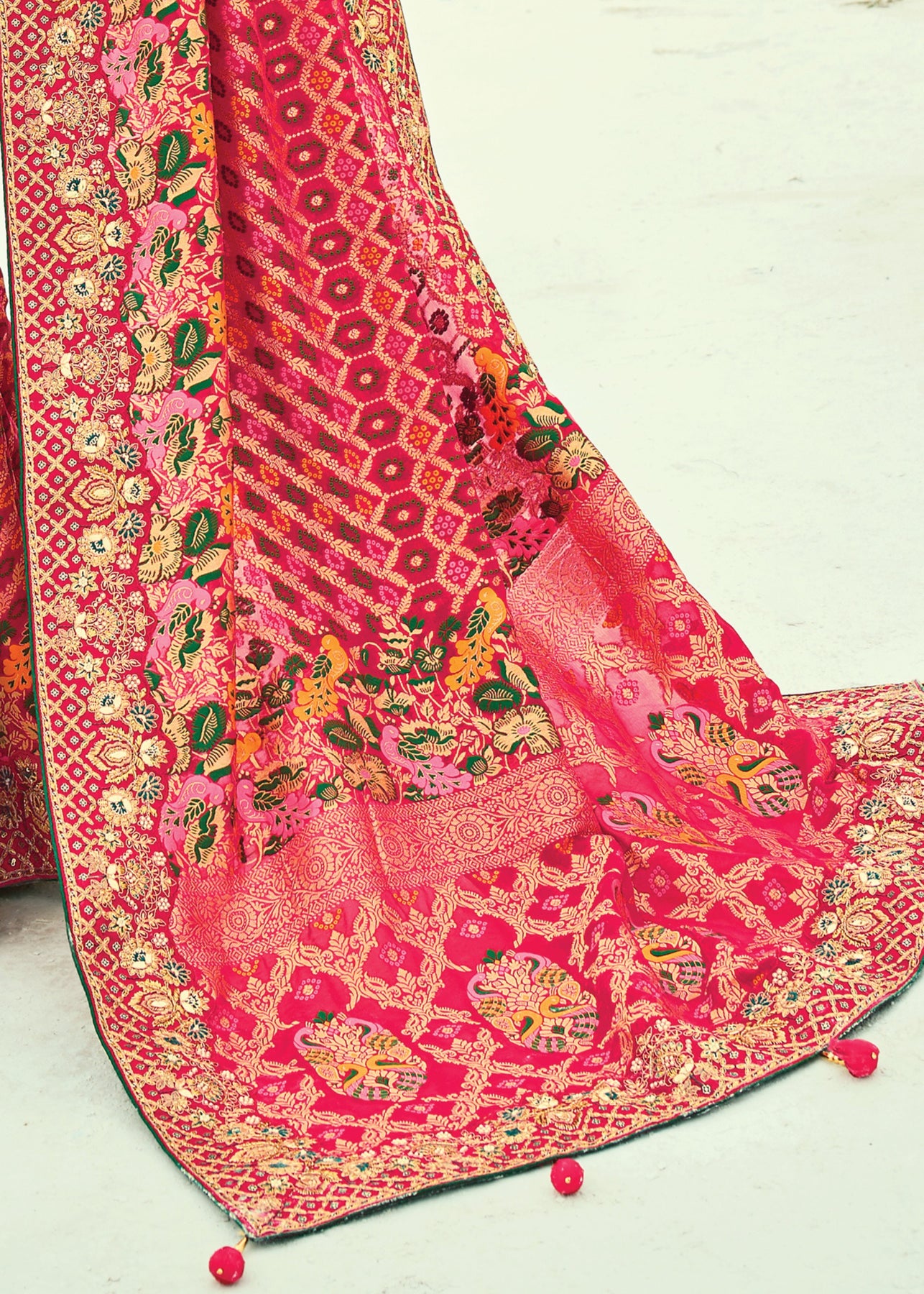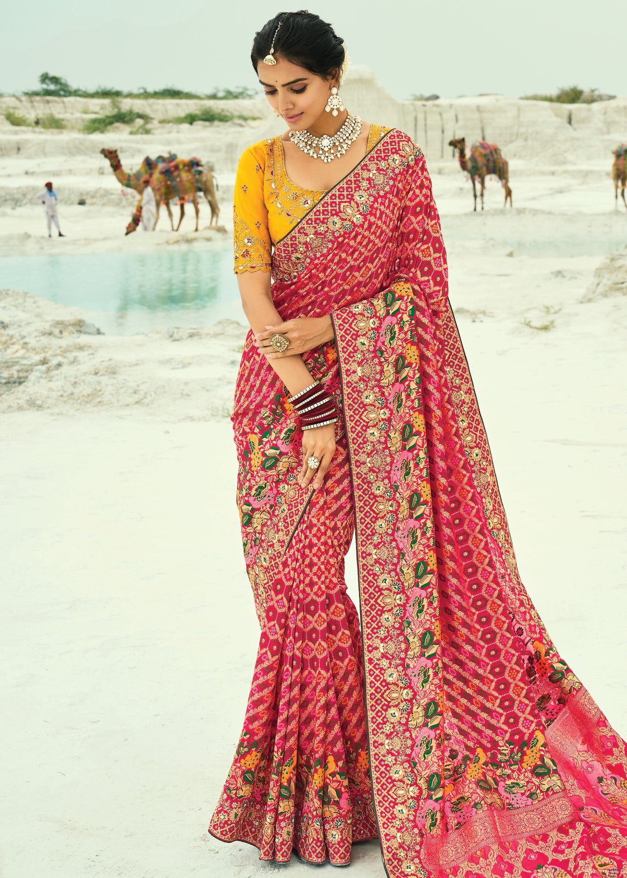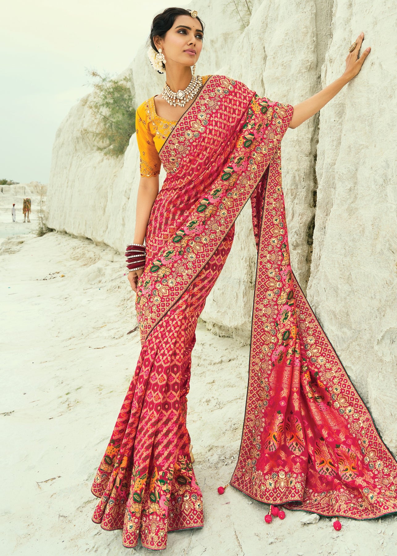French Pink Georgette Bandhej Saree With Moti & Cut-Dana Handwork Border