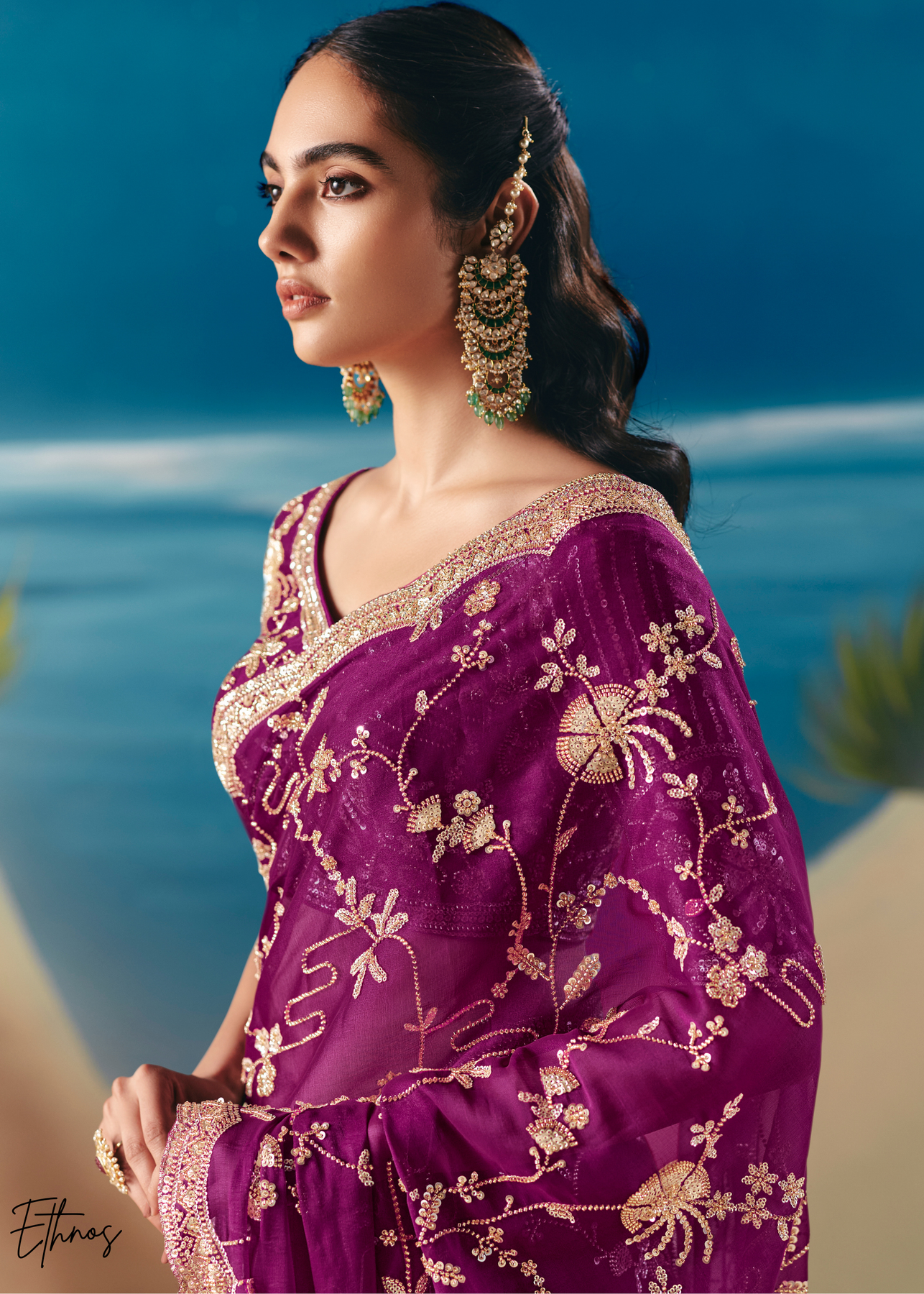 Radiate elegance in this stunning Magenta Purple Sequins Organza Saree, meticulously crafted with intricate designer embroidery, shimmering sequins, and delicate stone work. The premium fabric offers a luxurious sheen and graceful drape, making it an ideal choice for weddings and festive celebrations. This exquisite 5.5-meter drape comes paired with a matching embroidered blouse piece to complete your sophisticated ethnic ensemble.