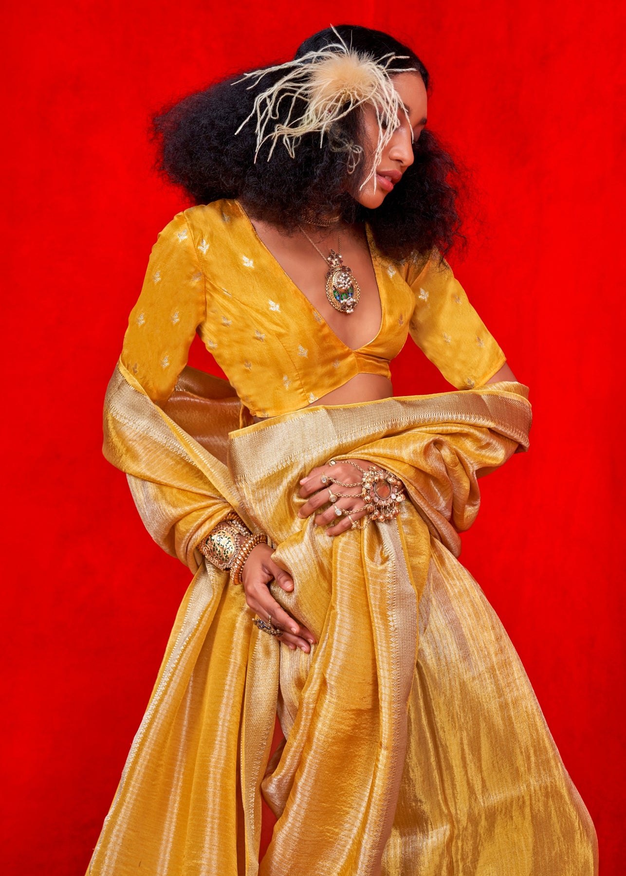 The Mustard Pure Viscose Zari Tissue Saree is a luxurious blend of traditional elegance and contemporary sophistication, making it a standout piece for any festive or formal occasion. Carefully crafted with fine viscose fabric, this saree is designed to offer a lightweight and fluid drape that enhances your silhouette while ensuring all-day comfort.