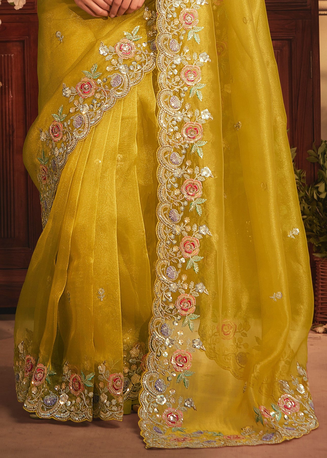 Mustard Yellow Tissue Organza Saree With Heavy Embroidery