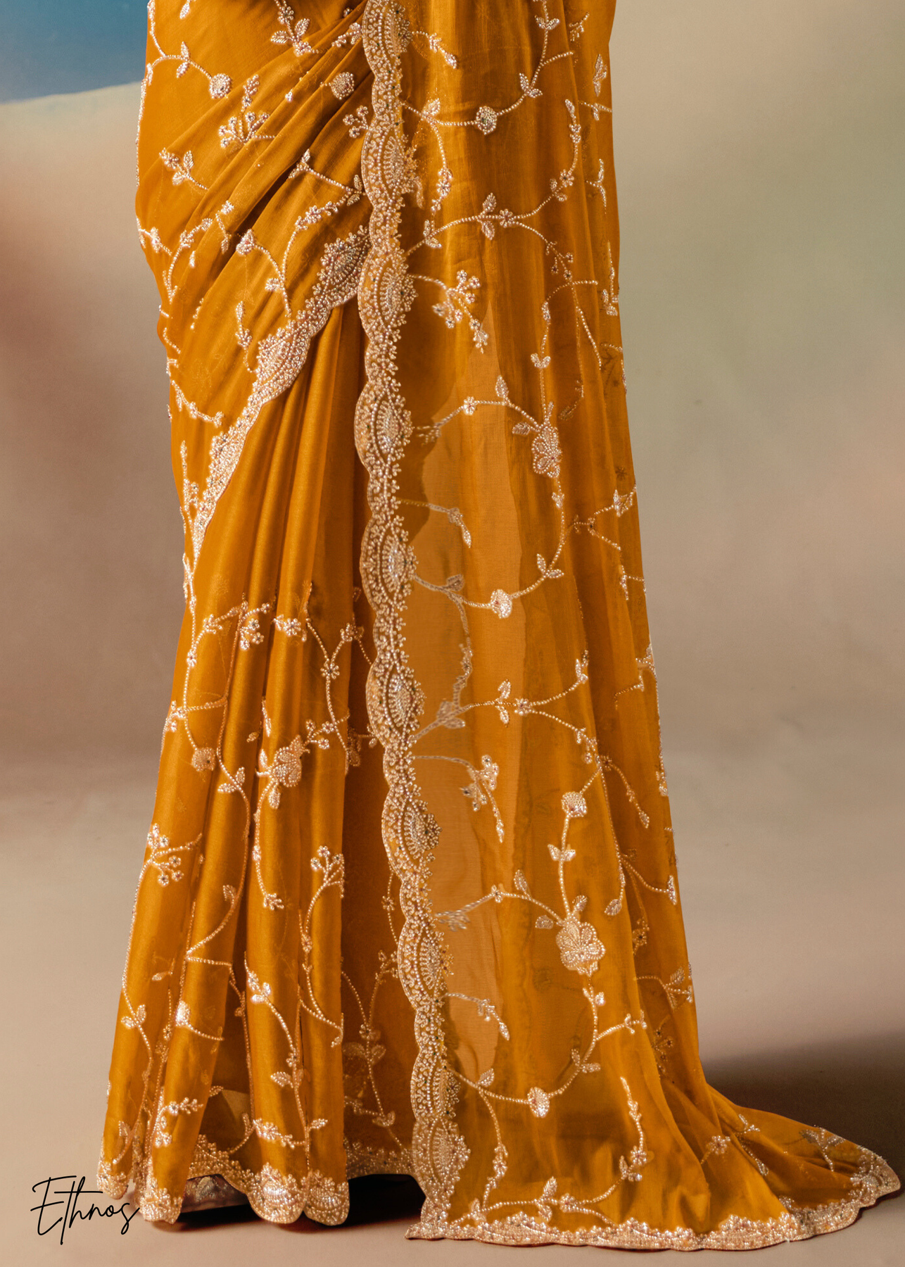 The Mustard Sequins Organza Saree offers a stunning blend of crispness and a dreamy, flowing drape. Its elegant design features gorgeous floral and vine embroidery motifs that float across the sheer fabric. A beautifully embellished border with delicate cut-work edges adds drama and structure, perfectly complemented by the matching blouse's lavish details.