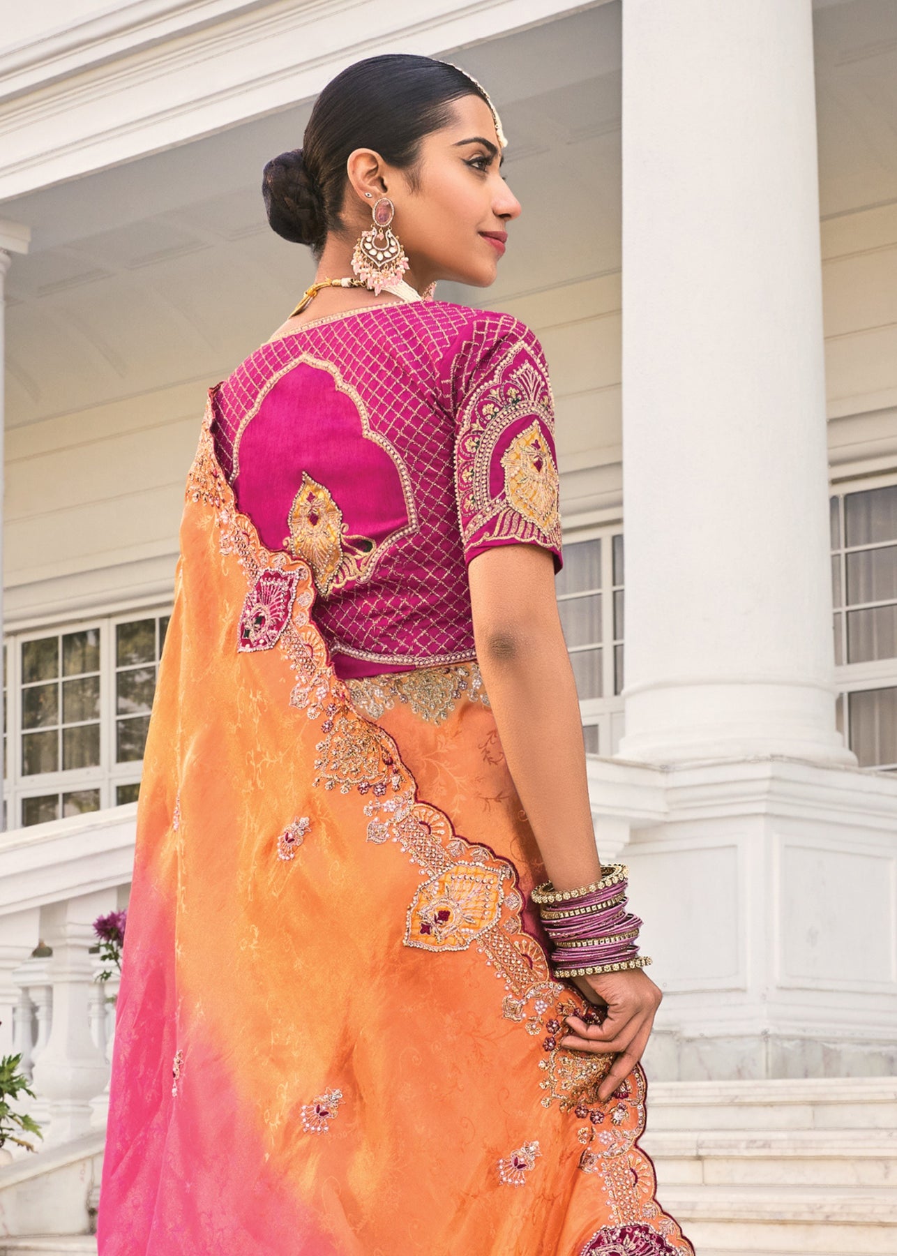Saree: Orange to Rani Natural Crape Jaquard Saree With Jari, Cut-Dana & Moti Heavy Work