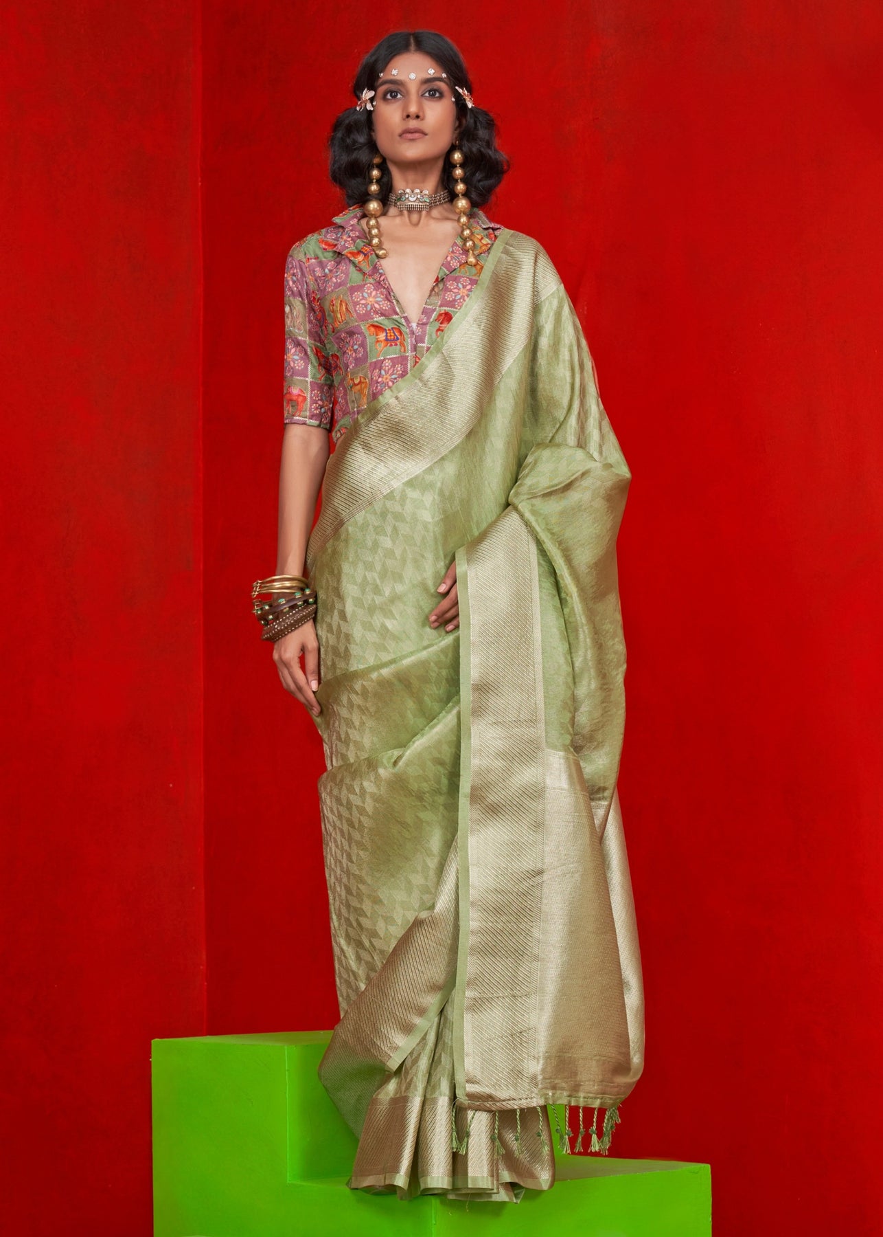 A soothing pear green viscose tissue silk saree featuring intricate zari work, ideal for both festive occasions and elegant evenings. The saree drapes beautifully with its soft, shimmering texture, complemented by a matching blended silk blouse, offers versatility in styling pleats, pallu, or classic wrap. Crafted to blend tradition and glamour, it makes a statement without overwhelming.
