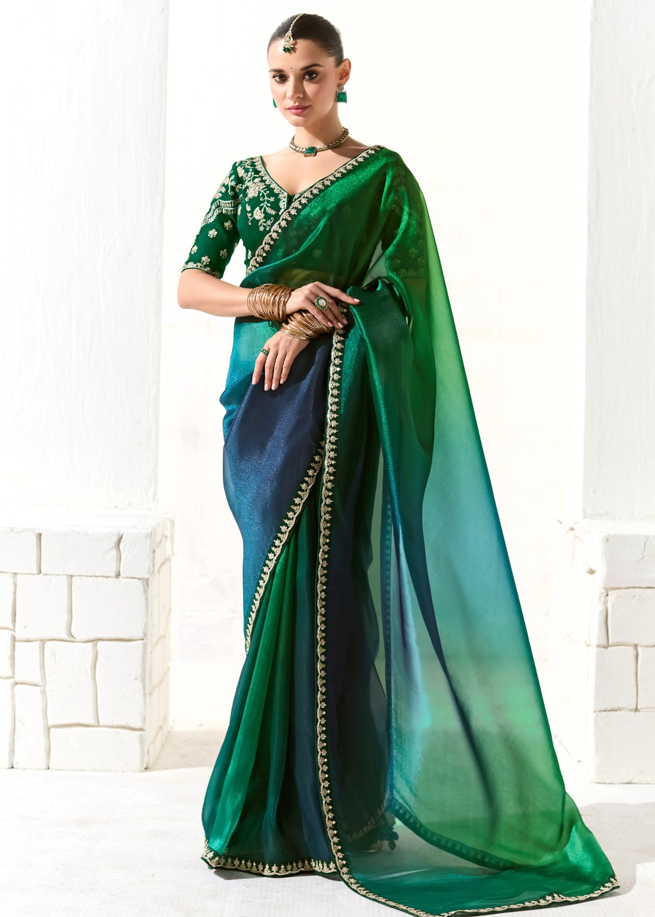Pine Green Organza Tissue Silk Saree With Heavy Work Border And Designer Blouse